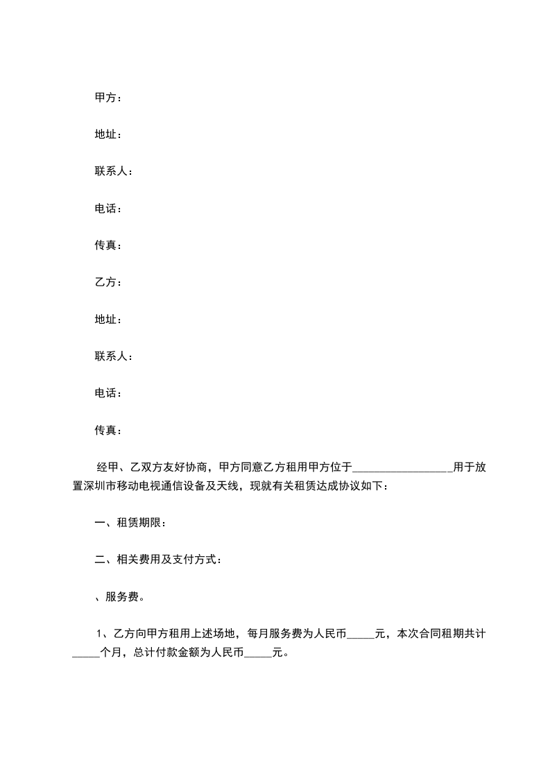 经甲、乙双方友好协商,甲方同意乙方租用甲方位于__________________用于放置深圳市移动电视通信设备及天线,现就有关租赁达成协议如下: