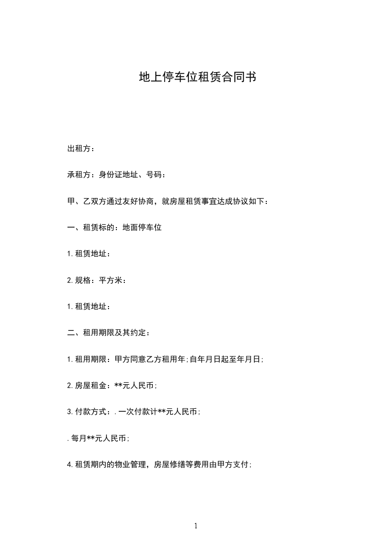 一、租赁标的:地面停车位