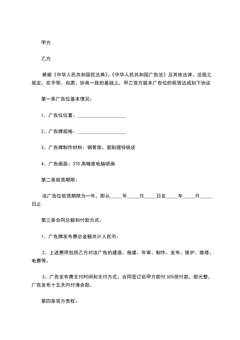 根据《中华人民共和国民法典》、《中华人民共和国广告法》及其他法律、法规之规定,在平等、自愿、协商一致的基础上,甲乙双方就本广告位的租赁达成如下协议:
