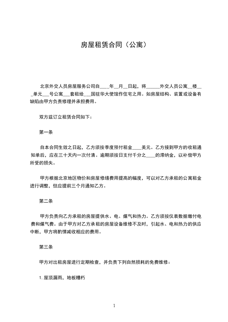 北京外交人员房屋服务公司自____年__月__日起,将______外交人员公寓__楼___单元___号公寓___套租给___国驻华大使馆作住宅之用。如房屋结构、装置或设备有缺陷由甲方负责修理并承担费用。