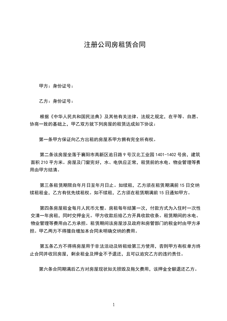 第二条该房屋坐落于襄阳市高新区追日路9号汉北工业园1401-1402号房,建筑面积210平方米。房屋及门窗完好,水、电供应正常,租赁前的水电、物业管理等费用由甲方结清。