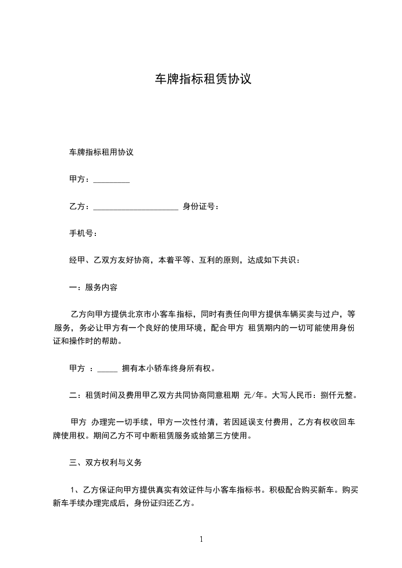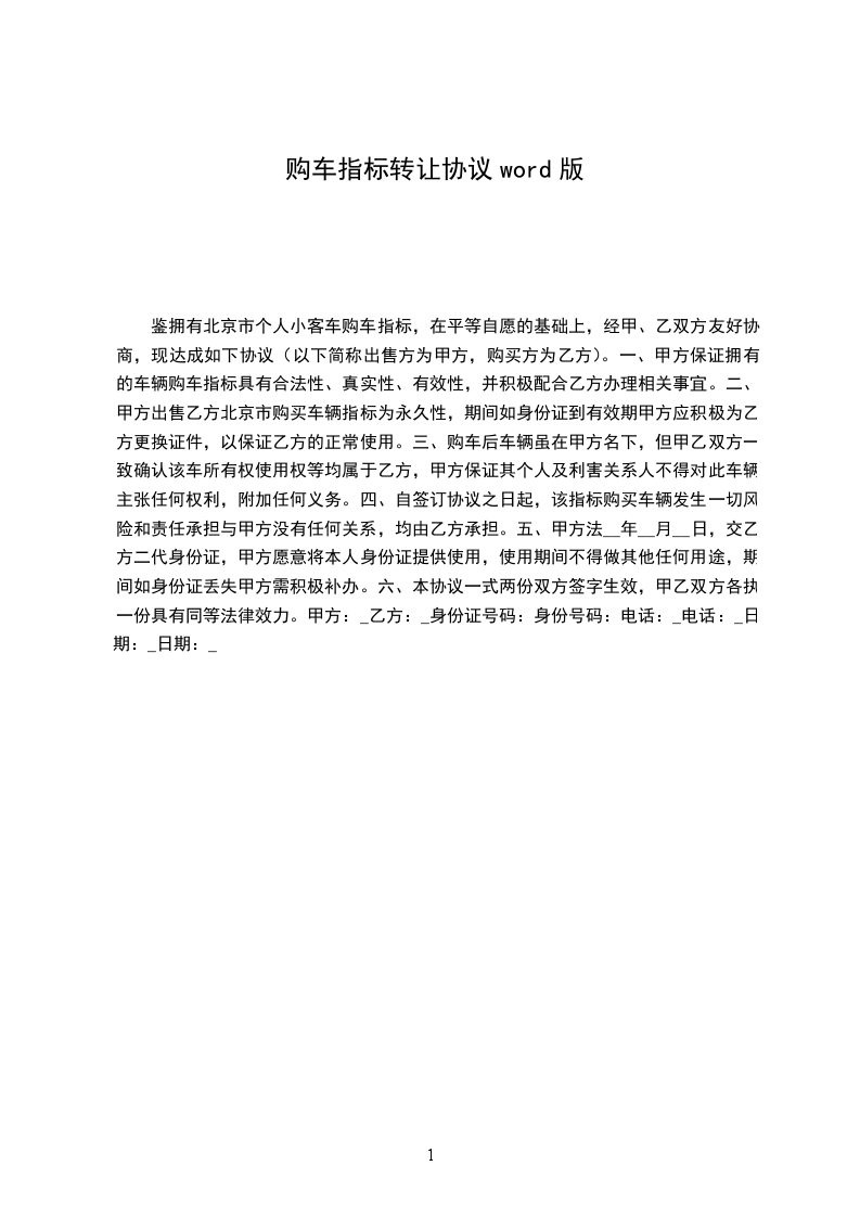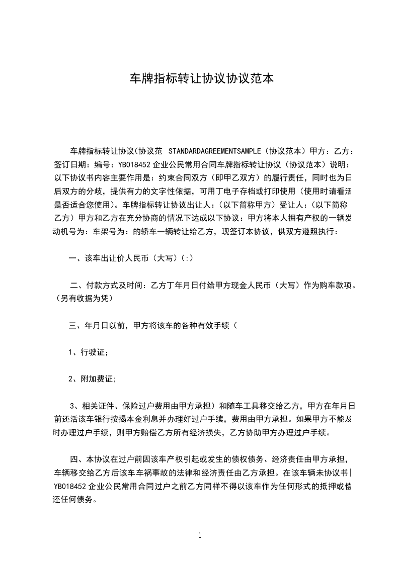 车牌指标转让协议(协议范STANDARDAGREEMENTSAMPLE(协议范本)甲方:乙方:签订日期:编号:YB018452企业公民常用合同车牌指标转让协议(协议范本)说明:以下协议书内容主要作用是:约束合同双方(即甲乙双方)的履行责任,同时也为日后双方的分歧,提供有力的文字性依据,可用丁电子存档或打印使用(使用时请看活是否适合您使用)。车牌指标转让协议出让人:(以下简称甲方)受让人:(以下简称乙方)甲方和乙方在充分协商的情况下达成以下协议:甲方将本人拥有产权的一辆发动机号为:车架号为:的轿车一辆转让给乙方,现签订本协议,供双方遵照执行: