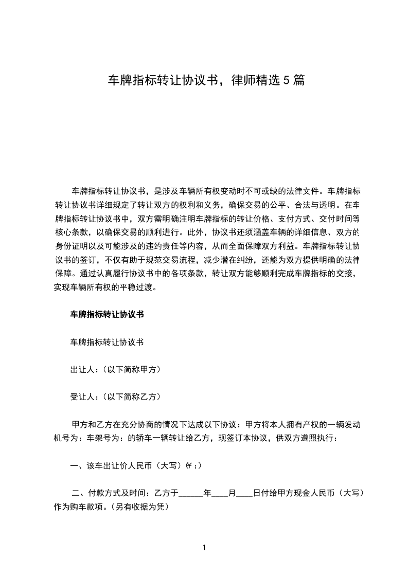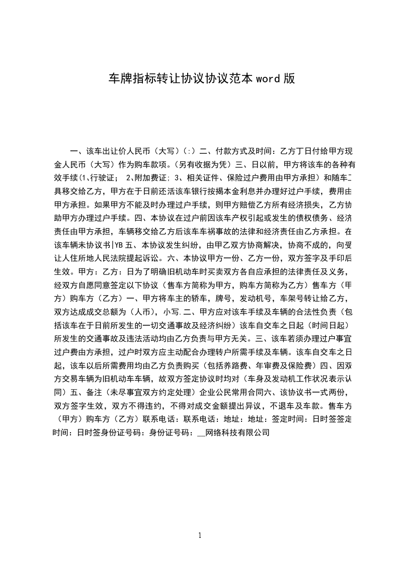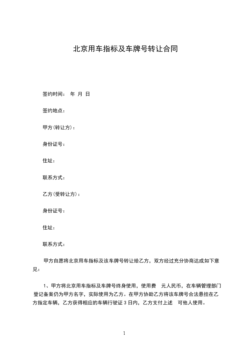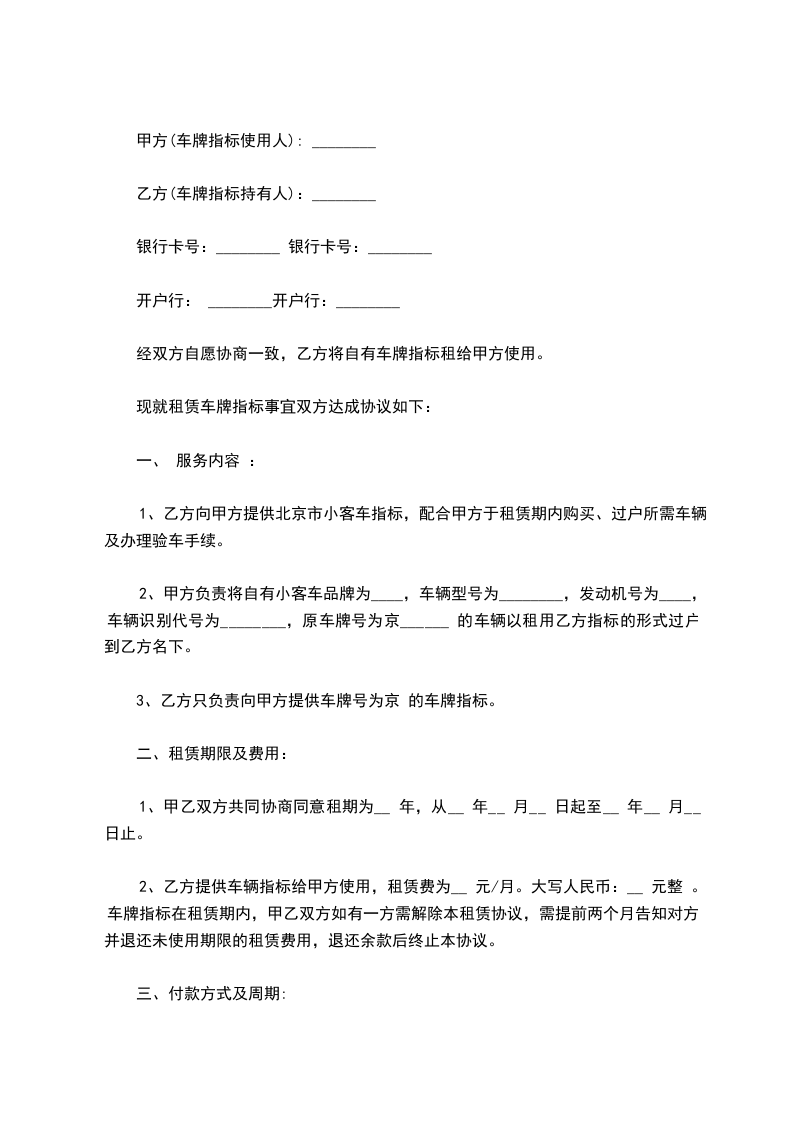车牌指标转让协议(协议范STANDARDAGREEMENTSAMPLE(协议范本)甲方:乙方:签订日期:编号:YB018452企业公民常用合同车牌指标转让协议(协议范本)说明:以下协议书内容主要作用是:约束合同双方(即甲乙双方)的履行责任,同时也为日后双方的分歧,提供有力的文字性依据,可用丁电子存档或打印使用(使用时请看活是否适合您使用)。车牌指标转让协议出让人:(以下简称甲方)受让人:(以下简称乙方)甲方和乙方在充分协商的情况下达成以下协议:甲方将本人拥有产权的一辆发动机号为:车架号为:的轿车一辆转让给乙方,现签订本协议,供双方遵照执行: