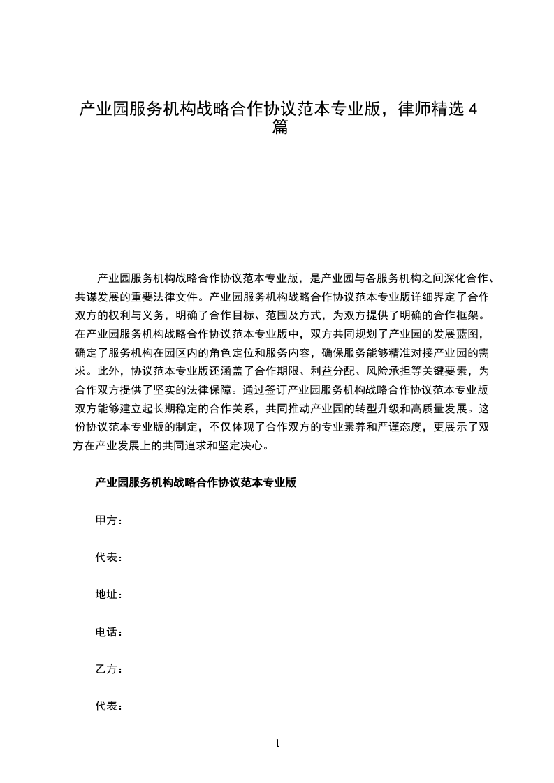产业园服务机构战略合作协议范本专业版,是产业园与各服务机构之间深化合作、共谋发展的重要法律文件。产业园服务机构战略合作协议范本专业版详细界定了合作双方的权利与义务,明确了合作目标、范围及方式,为双方提供了明确的合作框架。在产业园服务机构战略合作协议范本专业版中,双方共同规划了产业园的发展蓝图,确定了服务机构在园区内的角色定位和服务内容,确保服务能够精准对接产业园的需求。此外,协议范本专业版还涵盖了合作期限、利益分配、风险承担等关键要素,为合作双方提供了坚实的法律保障。通过签订产业园服务机构战略合作协议范本专业版,双方能够建立起长期稳定的合作关系,共同推动产业园的转型升级和高质量发展。这份协议范本专业版的制定,不仅体现了合作双方的专业素养和严谨态度,更展示了双方在产业发展上的共同追求和坚定决心。