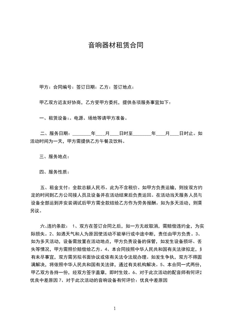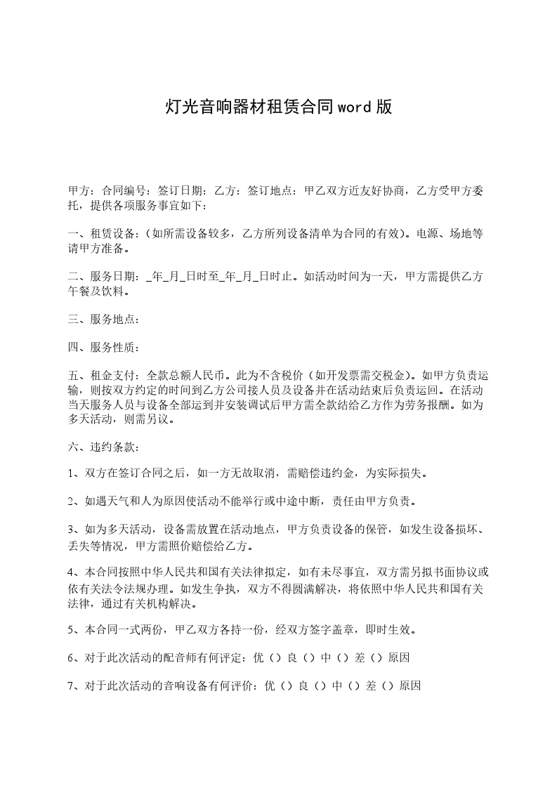 六、违约条款:1、双方在签订合同之后,如一方无故取消,需赔偿违约金,为实际损失。2、如遇天气和人为原因使活动不能举行或中途中断,责任由甲方负责。3、如为多天活动,设备需放置在活动地点,甲方负责设备的保管,如发生设备损坏、丢失等情况,甲方需照价赔偿给乙方。4、本合同按照中华人民共和国有关法律拟定,如有未尽事宜,双方需另拟书面协议或依有关法令法规办理。如发生争执,双方不得圆满解决,将依照中华人民共和国有关法律,通过有关机构解决。5、本合同一式两份,甲乙双方各持一份,经双方签字盖章,即时生效。6、对于此次活动的配音师有何评定:优良中差原因7、对于此次活动的音响设备有何评价:优良中差原因