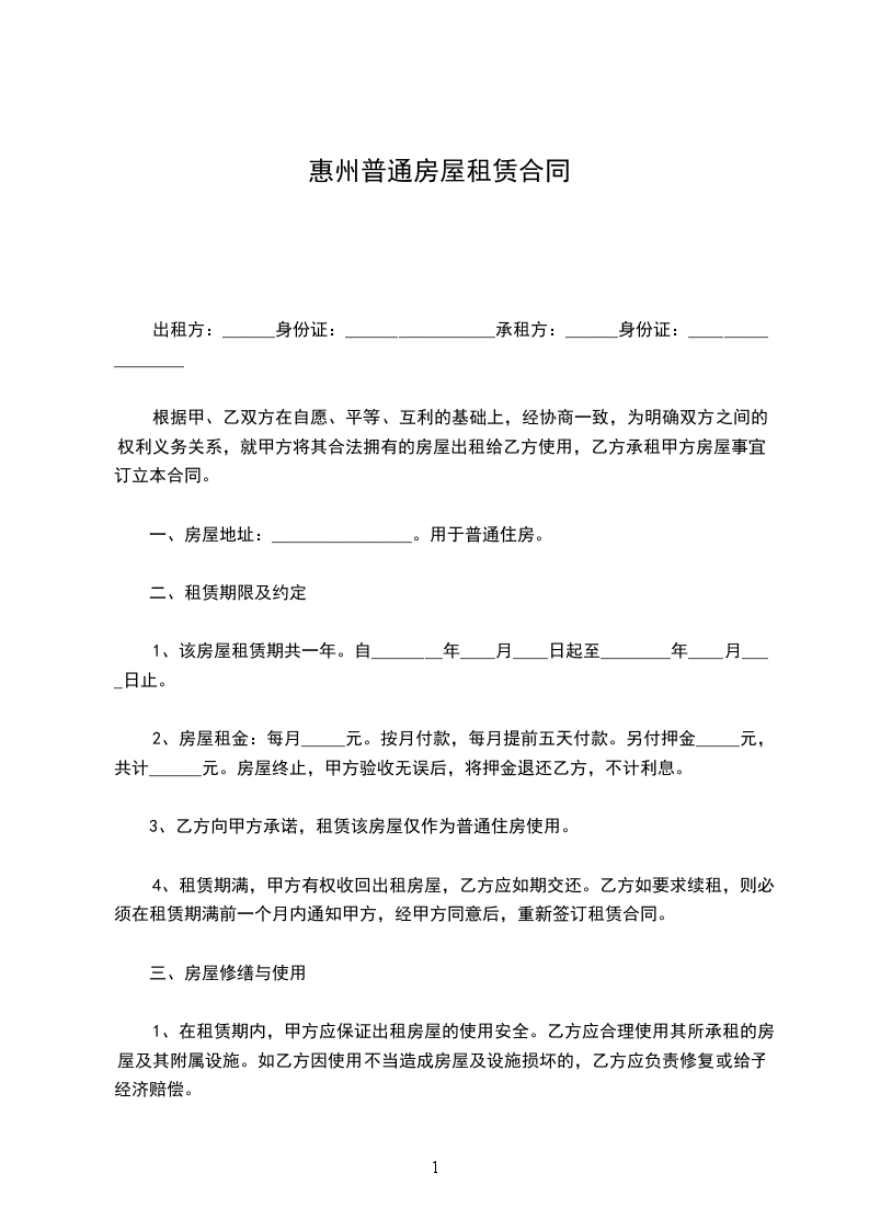 1、该房屋租赁期共一年。自________年____月____日起至________年____月____日止。
