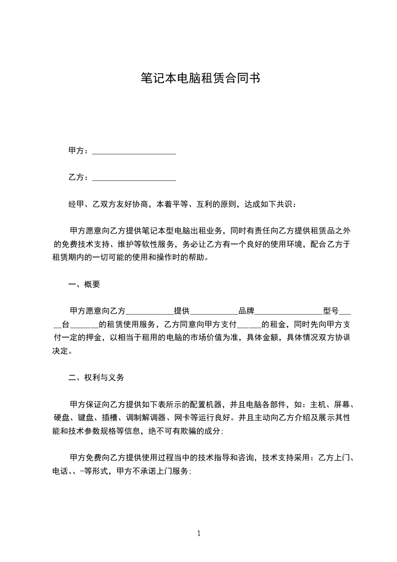 甲方愿意向乙方提供笔记本型电脑出租业务,同时有责任向乙方提供租赁品之外的免费技术支持、维护等软性服务,务必让乙方有一个良好的使用环境,配合乙方于租赁期内的一切可能的使用和操作时的帮助。