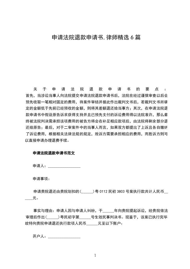 关于申请法院退款申请书的要点: