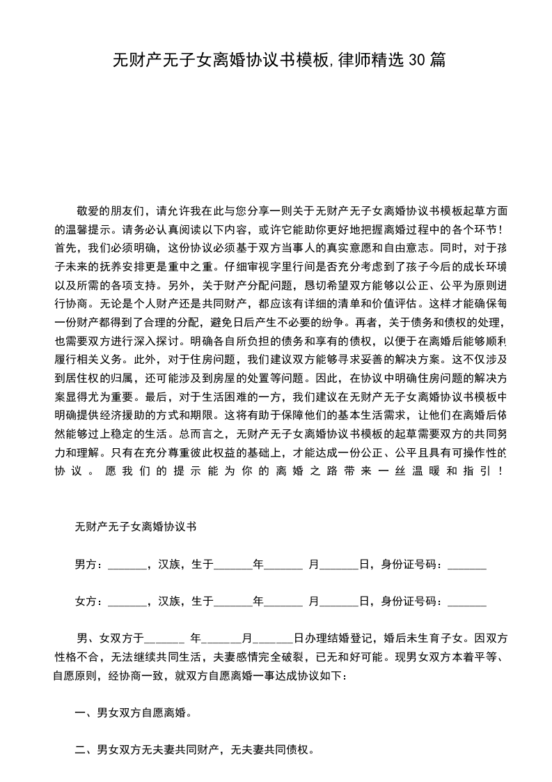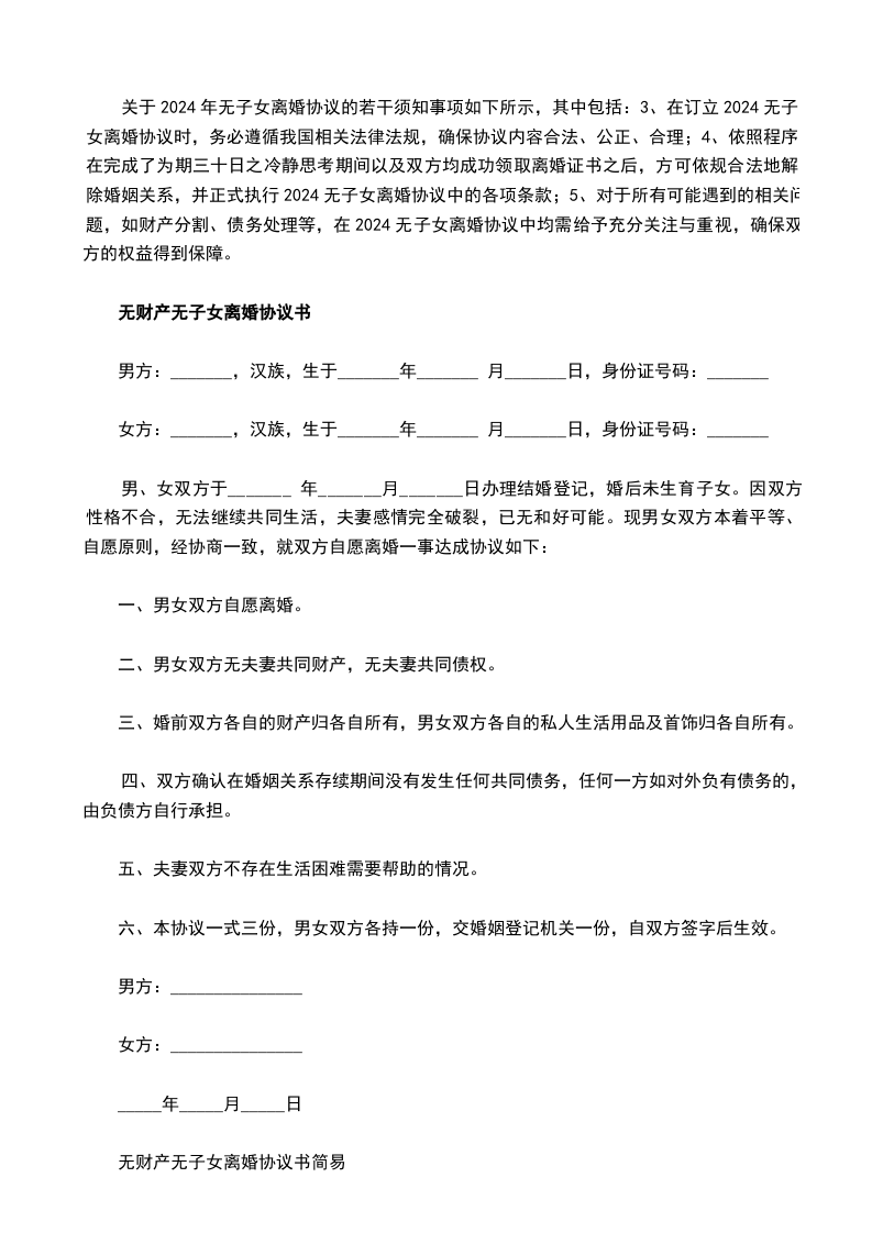 离婚协议书无子女无财产一