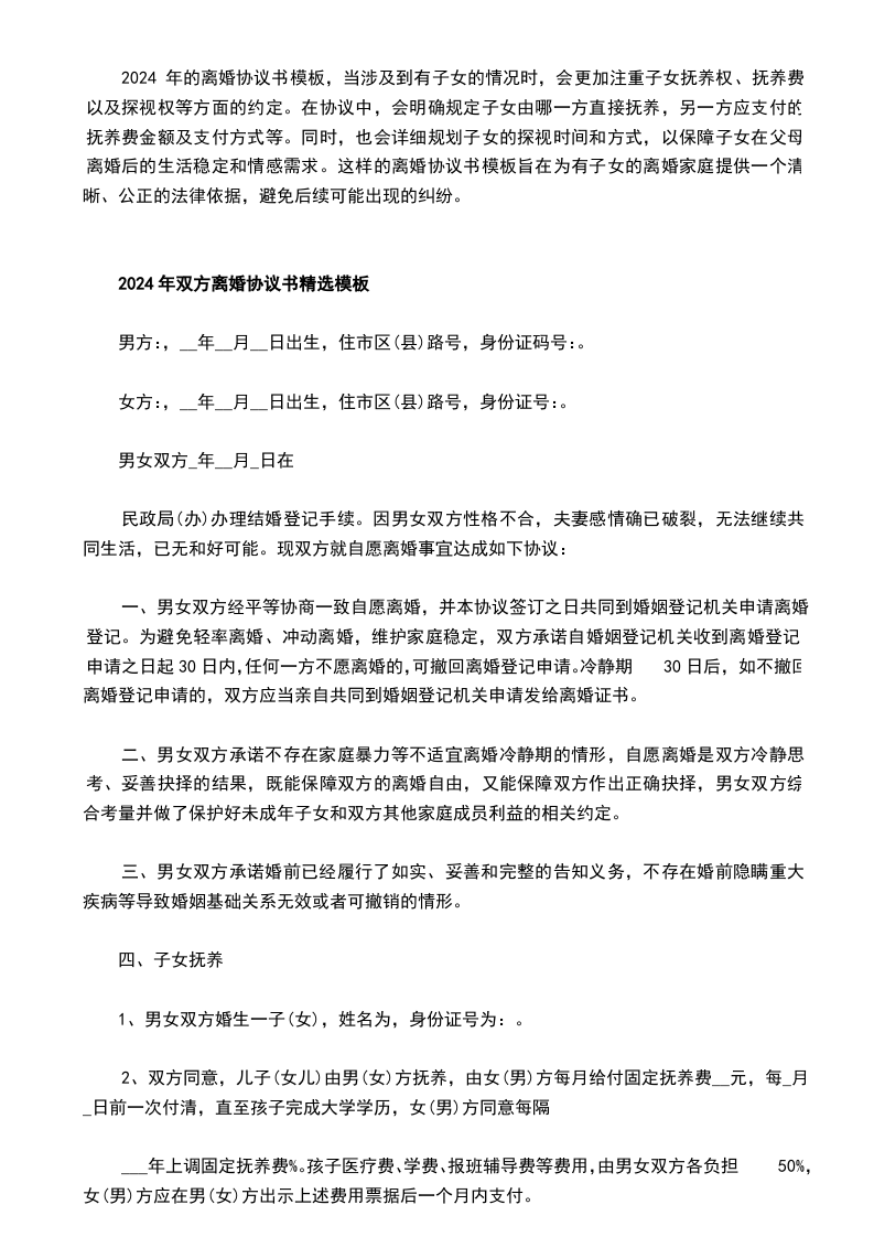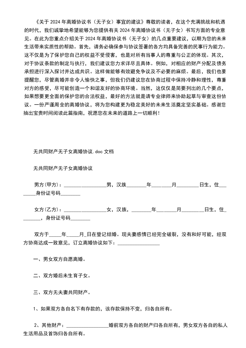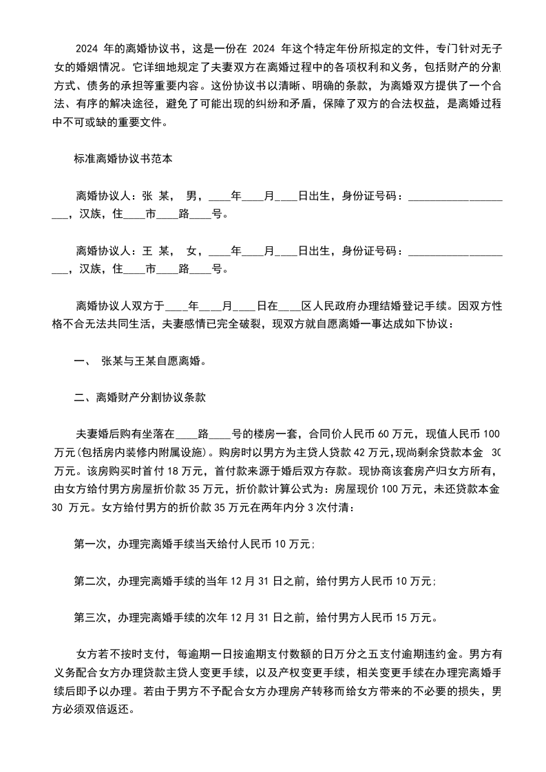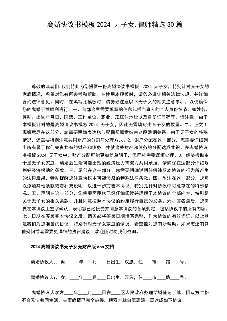 尊敬的客户:在此,我们为您提供一份离婚协议书模板2024 无子女,希望能为您在处理离婚事宜时提供实质性的帮助和指导。此范本旨在作为参考之用,诚挚建议您在使用过程中结合自身情况及需求进行适当调整和修改,以便使其更符合您的特定要求。首先,请您务必注意以下几点关于离婚协议书模板2024 无子女无子女1. 离婚协议范本仅供参考,切勿全盘照抄。为了确保离婚协议能够有效地解决实际问题,您需要根据实际情况对范本进行补充和完善。特别是在涉及到具体细节的部分,如财产分割等方面,应尽可能详细地予以明确。2. 在撰写离婚协议时,建议您尽可能将各项条款细化。这样做有助于减少未来可能出现的不必要纷争,同时也有利于维护双方的合法权益。特别是针对离婚协议书模板2024 无子女中无子女的特殊情况,您应明确双方关于子女抚养权的约定,以避免日后产生误解或纠纷。3. 请谨慎对待对离婚协议的任何形式的更改或重新起草。因为这可能会导致协议内容发生变化,从而影响到您的权益。因此,除非有特殊原因,否则不应随意更改或重写协议。4. 对于对方是否存在隐瞒夫妻共同财产的行为,您有权进行深入调查。通过婚姻调查,您可以了解对方的财产状况,并在必要时约定隐瞒财产所应承担的法律责任。这同样适用于协议,确保双方对财产分割有明确的了解和认可。最后,我们再次强调,协议只是一个参考工具,不能替代您的个性化需求。如果您在使用过程中有任何疑问或需要进一步的协助,欢迎随时与我们联系。我们将竭尽全力为您提供最优质的服务。祝您生活愉快!顺祝商祺!