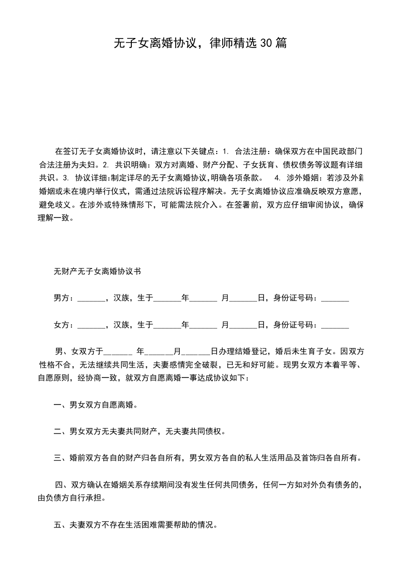 离婚协议书无子女