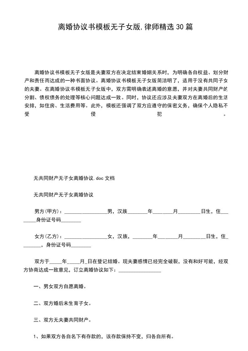 离婚协议书无子女1