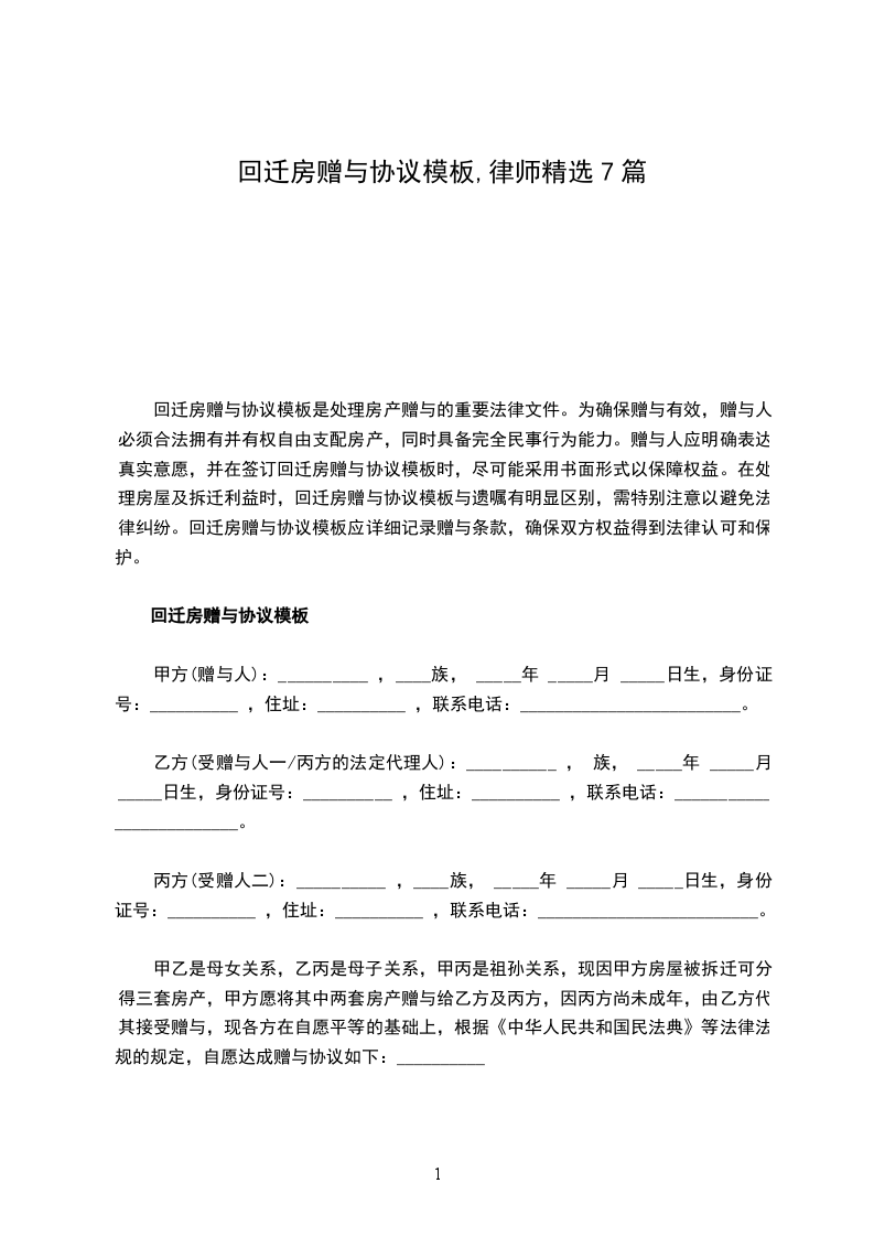 回迁房赠与协议书