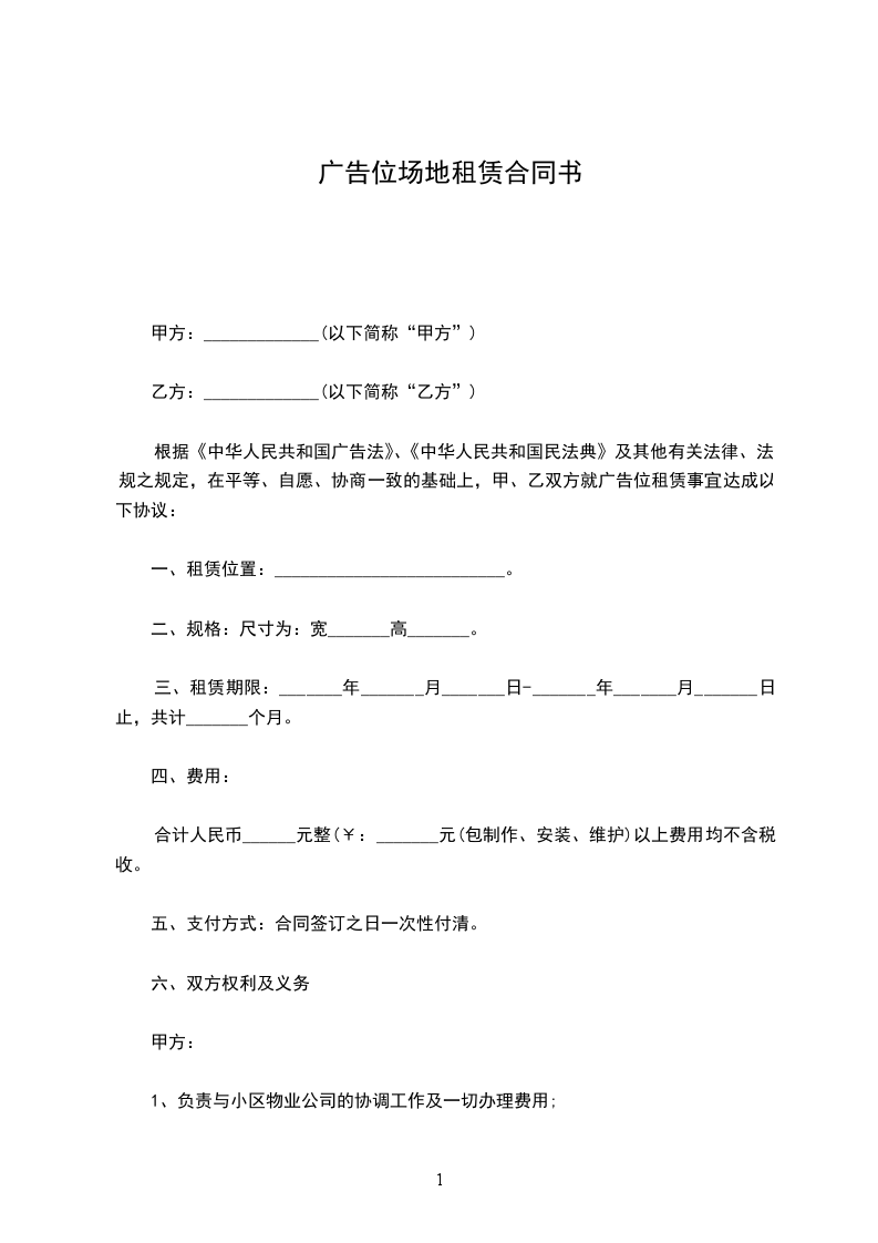 1.合作事项:乙方租赁:广告位,并支付一定的租赁费于甲方。