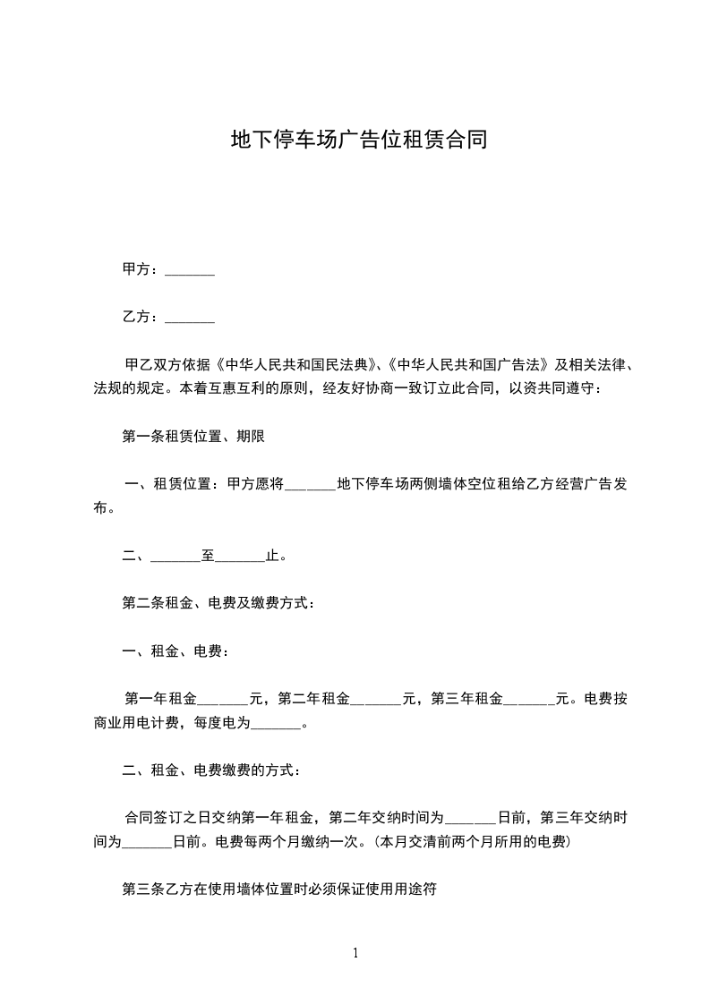 一、租赁位置:甲方愿将___地下停车场两侧墙体空位租给乙方经营广告发布。