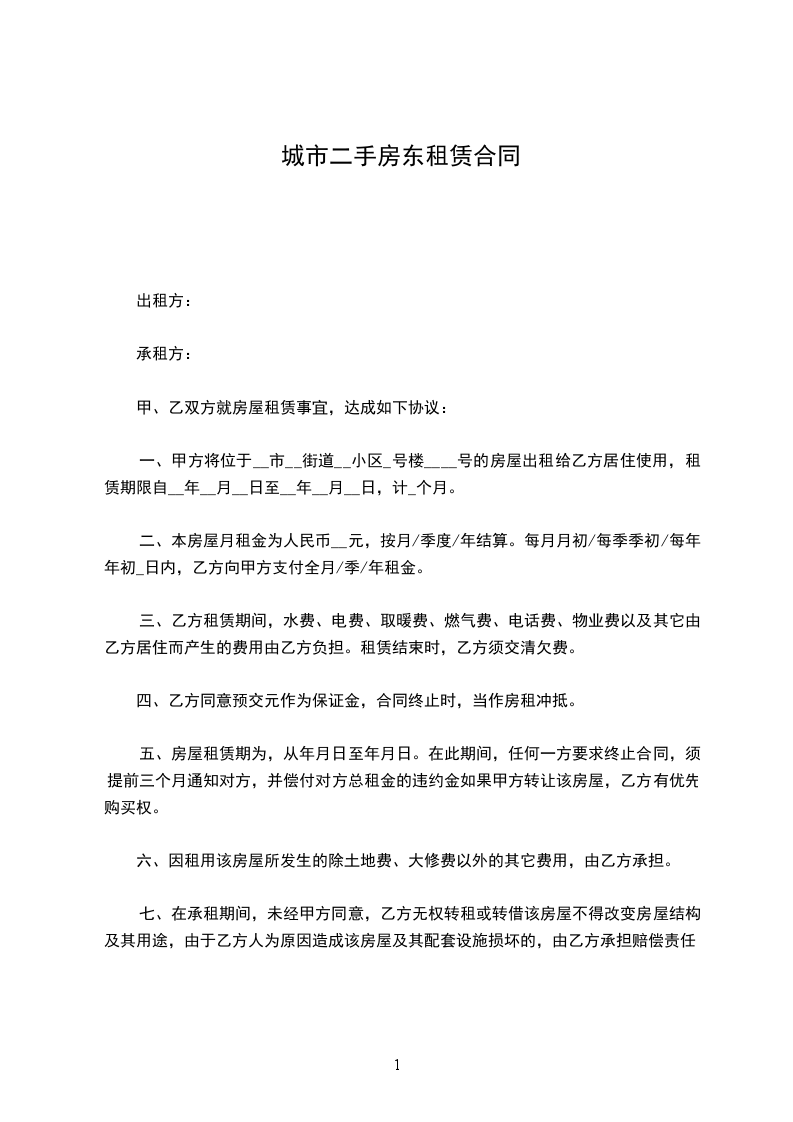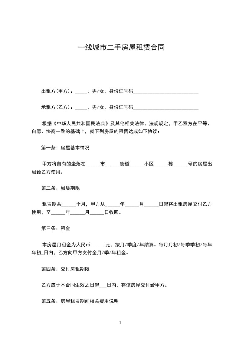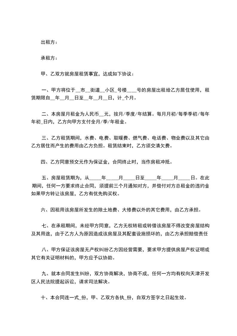 一、甲方将位于__市__街道__小区_号楼____号的房屋出租给乙方居住使用,租赁期限自__年__月__日至__年__月__日,计_个月。