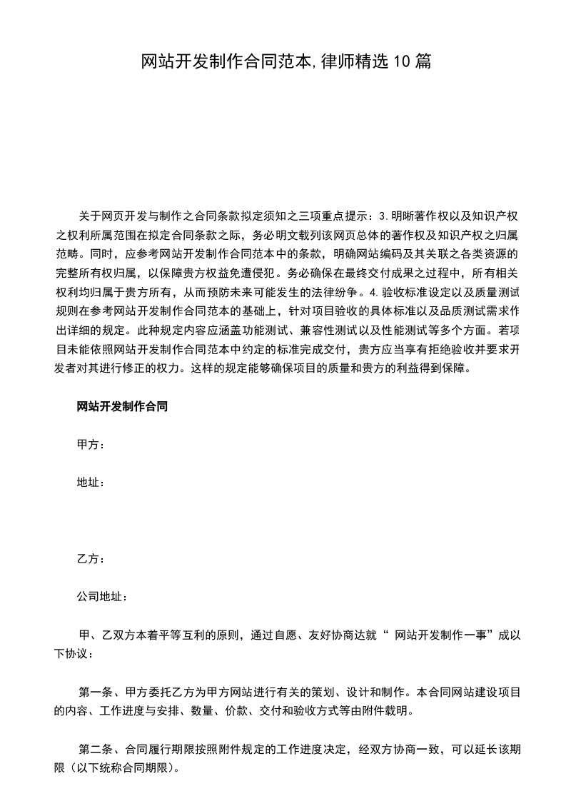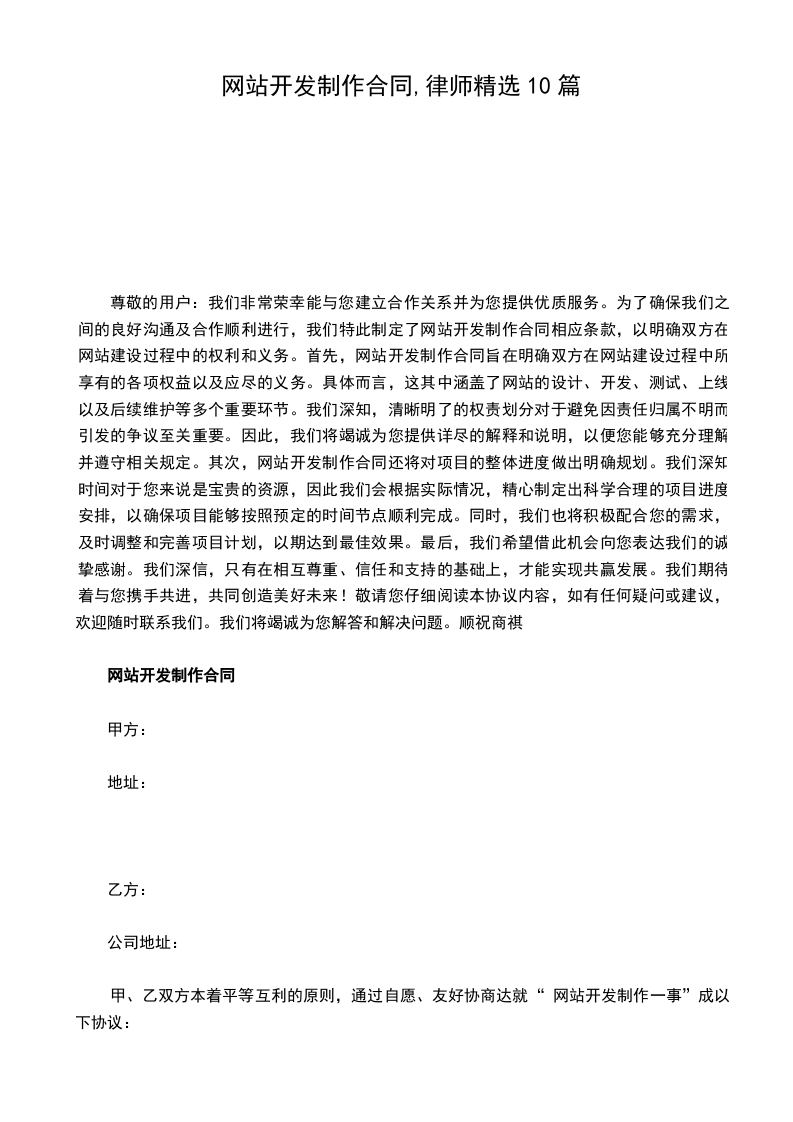 尊敬的用户:我们非常荣幸能与您建立合作关系并为您提供优质服务。为了确保我们之间的良好沟通及合作顺利进行,我们特此制定了网站开发制作合同相应条款,以明确双方在网站建设过程中的权利和义务。首先,网站开发制作合同旨在明确双方在网站建设过程中所享有的各项权益以及应尽的义务。具体而言,这其中涵盖了网站的设计、开发、测试、上线以及后续维护等多个重要环节。我们深知,清晰明了的权责划分对于避免因责任归属不明而引发的争议至关重要。因此,我们将竭诚为您提供详尽的解释和说明,以便您能够充分理解并遵守相关规定。其次,网站开发制作合同还将对项目的整体进度做出明确规划。我们深知时间对于您来说是宝贵的资源,因此我们会根据实际情况,精心制定出科学合理的项目进度安排,以确保项目能够按照预定的时间节点顺利完成。同时,我们也将积极配合您的需求,及时调整和完善项目计划,以期达到最佳效果。最后,我们希望借此机会向您表达我们的诚挚感谢。我们深信,只有在相互尊重、信任和支持的基础上,才能实现共赢发展。我们期待着与您携手共进,共同创造美好未来!敬请您仔细阅读本协议内容,如有任何疑问或建议,欢迎随时联系我们。我们将竭诚为您解答和解决问题。顺祝商祺