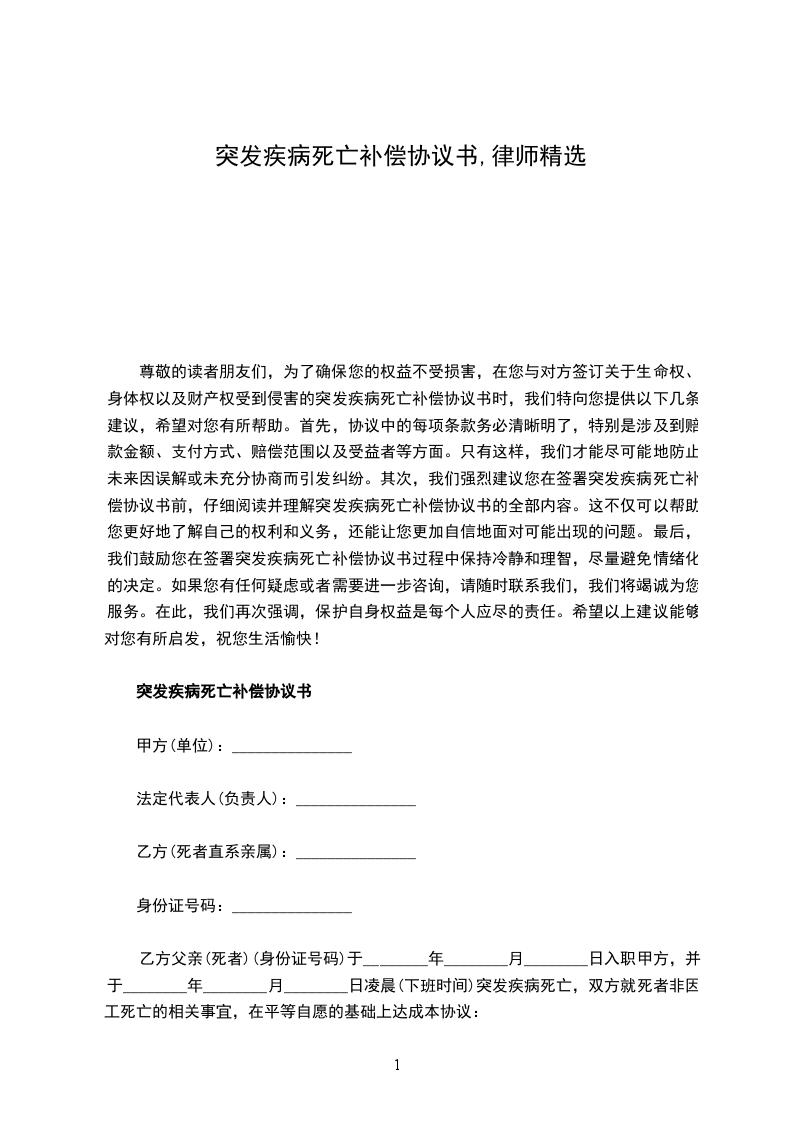 尊敬的读者朋友们,为了确保您的权益不受损害,在您与对方签订关于生命权、身体权以及财产权受到侵害的突发疾病死亡补偿协议书时,我们特向您提供以下几条建议,希望对您有所帮助。首先,协议中的每项条款务必清晰明了,特别是涉及到赔款金额、支付方式、赔偿范围以及受益者等方面。只有这样,我们才能尽可能地防止未来因误解或未充分协商而引发纠纷。其次,我们强烈建议您在签署突发疾病死亡补偿协议书前,仔细阅读并理解突发疾病死亡补偿协议书的全部内容。这不仅可以帮助您更好地了解自己的权利和义务,还能让您更加自信地面对可能出现的问题。最后,我们鼓励您在签署突发疾病死亡补偿协议书过程中保持冷静和理智,尽量避免情绪化的决定。如果您有任何疑虑或者需要进一步咨询,请随时联系我们,我们将竭诚为您服务。在此,我们再次强调,保护自身权益是每个人应尽的责任。希望以上建议能够对您有所启发,祝您生活愉快!