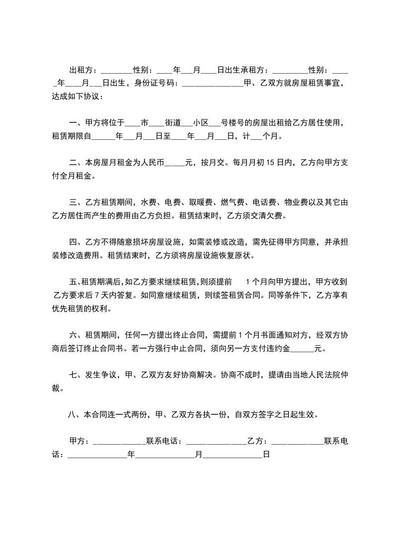 出租方:________性别:____年___月____日出生承租方:_________性别:_____年____月___日出生,身份证号码:_______________甲、乙双方就房屋租赁事宜,达成如下协议: