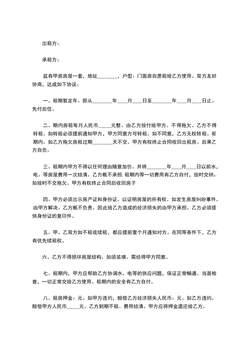 兹有甲房房屋一套,地址________,户型:门面房自愿租给乙方使用。双方友好协商,达成如下协议: