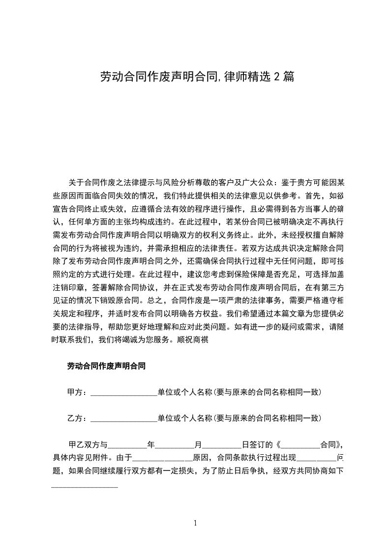 关于劳动合同效力终止及作废声明本声明旨在针对劳动合同效力终止及劳动合同作废声明合同的相关事宜进行详细说明,为合同当事方提供清晰明确的指引和操作规范。请务必审慎阅读并理解以下内容,以确保合同关系的妥善处理。1. 合同解除之自愿性与违约责任劳动合同的解除必须得到合同双方的共同认可。未经对方同意而单方面解除合同,将被视为违约行为,需承担相应的法律责任。因此,在决定解除合同时,应充分考虑自身权益及合同义务,确保双方达成共识后再行实施,并发布劳动合同作废声明合同。2. 合同解除之程序与手续若双方均同意解除合同,并完成了劳动合同作废声明合同的签署,应确保合同执行过程中无任何争议或纠纷,再进行后续的解除流程。具体而言,可通过签署书面协议、加盖注销印章等方式确认合同解除事实;如有必要,也可在第三方见证下对原合同进行销毁。3. 保险保障之补充措施对于因合同解除可能导致的保险保障不足问题,在发布合同后,建议采取以下措施予以应对:首先,可根据实际情况选择是否续保;其次,可咨询保险公司了解其他替代方案;最后,在解除合同前,应确保已妥善处理好相关保险事宜。总之,合同解除及作废声明是一项严肃且重要的法律事务,各方应秉持诚信原则,依法依规行事,以维护自身合法权益。如有疑问或困难,请及时寻求专业人士的帮助。