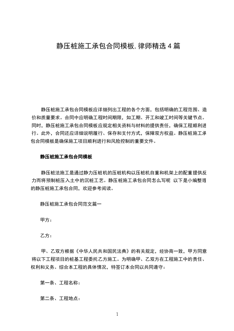 甲方 :_________乙 方:代表人:_____ _________ _____ 代表人:_____ _________ _____ 签字日期:_____年_____月_____日 签字日期:_____年_____月_____日 静压桩施工承包合同范文篇三发包单位:(简称发包方)承包单位:(简称承包方)为明 确双方的权利义务,根据《中华人民共和国民法典》和《建筑法》等有关法律、法规签订本合同,共同遵守。