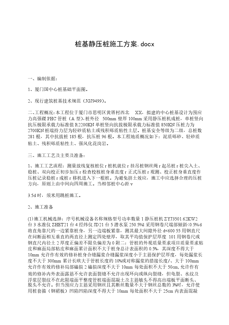 按甲方提供的梧州市旺甫工业园区鑫华-通(广西)科技园s#厂房]=程的桩基础的静压预应力混凝土管桩工程进行包工施工作业。如超出该工程要求的工程量或甲方要求更改,增减的工程量,均按实际工程量相应增减结算。按设计图要求共1 5 3根桩,有效桩长初定为15 - 20米,单桩竖向承载特征值QUK2600KFI,静压桩施工终压力承载值qqK 4600Kpa.设计要求管桩采用①500 x IOOA型号的管桩。