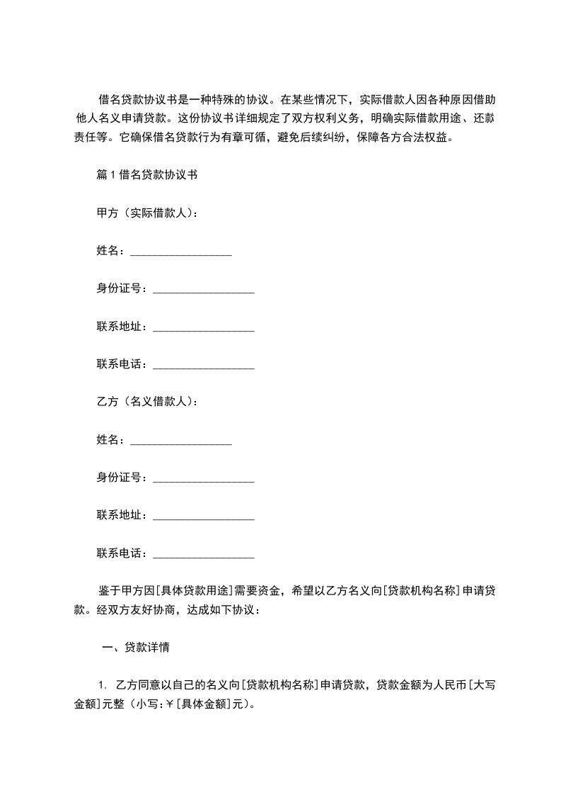 甲方(借名人):_身份证号:_地址:_联系电话乙方(出借人):_身份证号:_地址:_联系电话:_甲方因客观原因不能用自己名义向__银行申请贷款,经乙方同意甲方用乙方的名义贷款,经双方协商达成如下协议,以资共同遵守。_年_月_日甲方以乙方名义向申请贷款万元,借贷期限为_个月,自_年_月_日起至_年_月_日止,借款利率为。