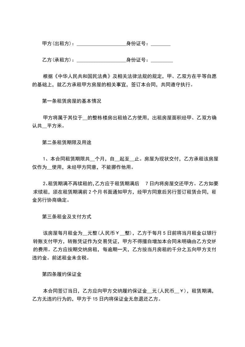 根据《中华人民共和国民法典》及相关法律法规的规定,甲、乙双方在平等、自愿的基础上,就甲方将房屋整体出租给乙方,乙方承租甲方房屋事宜,经协商一致,订立本合同。