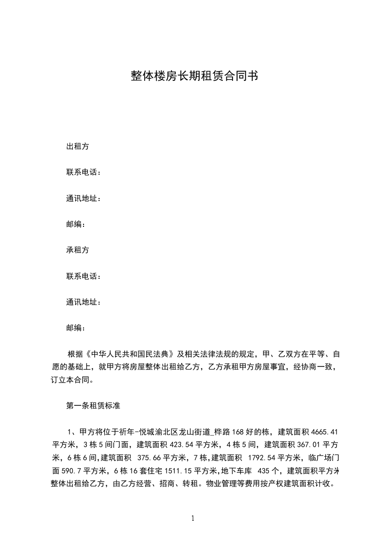 1、甲方将位于祈年-悦城渝北区龙山街道_桦路168好的栋,建筑面积4665.41平方米,3栋5间门面,建筑面积423.54平方米,4栋5间,建筑面积367.01平方米,6栋6间,建筑面积375.66平方米,7栋,建筑面积1792.54平方米,临广场门面590.7平方米,6栋16套住宅1511.15平方米,地下车库435个,建筑面积平方米,整体出租给乙方,由乙方经营、招商、转租。物业管理等费用按产权建筑面积计收。