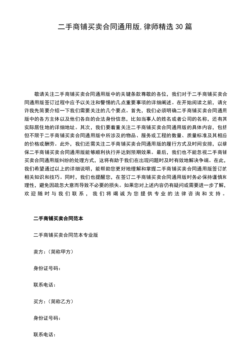 尊敬的用户,在您需要签订二手商铺买卖合同通用版或协议之前,我们为您提供的关于二手商铺买卖合同通用版条款的简要指南。二手商铺买卖合同通用版中应当包含的重要内容如下:1. 首先,二手商铺买卖合同通用版应明确双方当事人的身份信息及联系地址,以便后续履约过程中的沟通与合作。2. 其次,二手商铺买卖合同通用版必须规定交易的具体内容,这被称为“标的”,包括货物或服务的描述以及相关要求。3. 接下来,二手商铺买卖合同通用版需明确交易的数量,以确保交易的准确性和完整性。4. 然后,二手商铺买卖合同通用版还需对交易的质量进行详细说明,以保证交易的品质符合双方的期望。5. 此外,二手商铺买卖合同通用版还应明确交易的价格或报酬,以避免因价格问题产生纠纷。6. 为了确保交易的顺利执行,二手商铺买卖合同通用版还应明确履行的时间、地点和方式等细节。7. 最后,二手商铺买卖合同通用版还应规定违约责任,以保障双方的合法权益。8. 如果出现任何争议,二手商铺买卖合同通用版也应明确解决争议的途径和方式,以维护双方的利益。希望以上提示能帮助您更好地理解二手商铺买卖合同通用版条款,并在签署二手商铺买卖合同通用版时做出明智的决策。如有任何疑问,请随时向我们咨询。