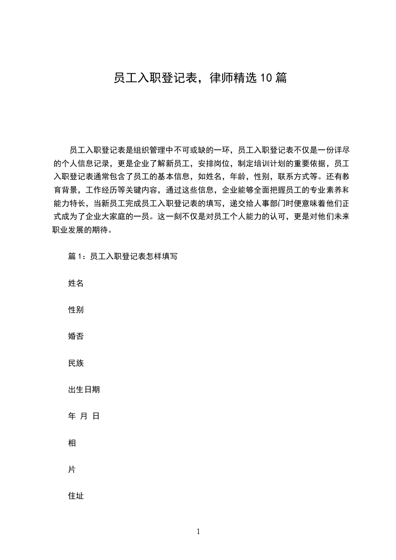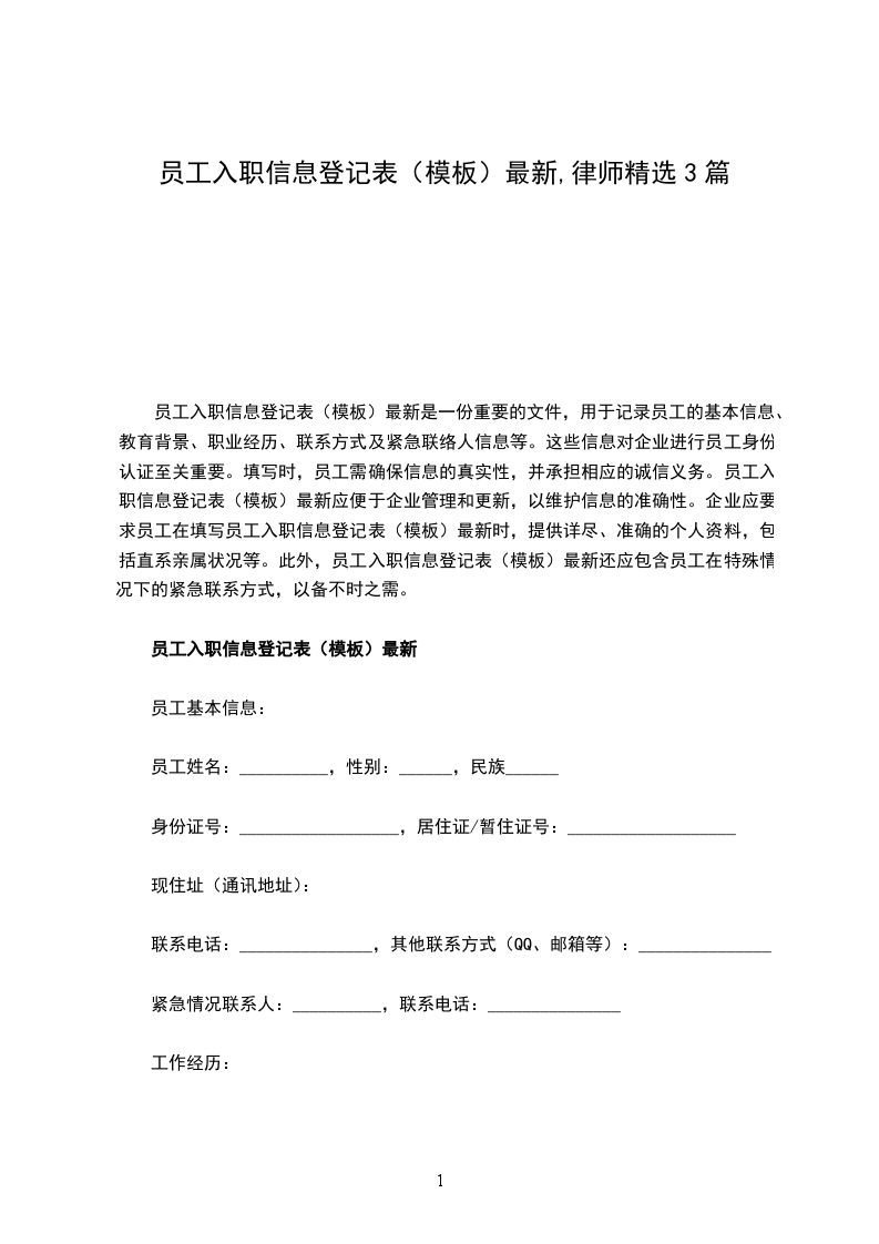 员工入职信息登记表(模板)最新主要用于公司内部人事管理,如记录员工个人信息和招聘细节,不具有法律约束力。尽管如此,公司会根据表中信息如个人背景和工作经验了解求职者,辅助人员选拔和面试安排。员工入职信息登记表(模板)最新对公司具有参考价值,是记录新员工信息的重要工具。公司应确保其内容真实,以便于有效管理。员工入职信息登记表(模板)最新虽非法律文件,但在招聘和管理中发挥关键作用。