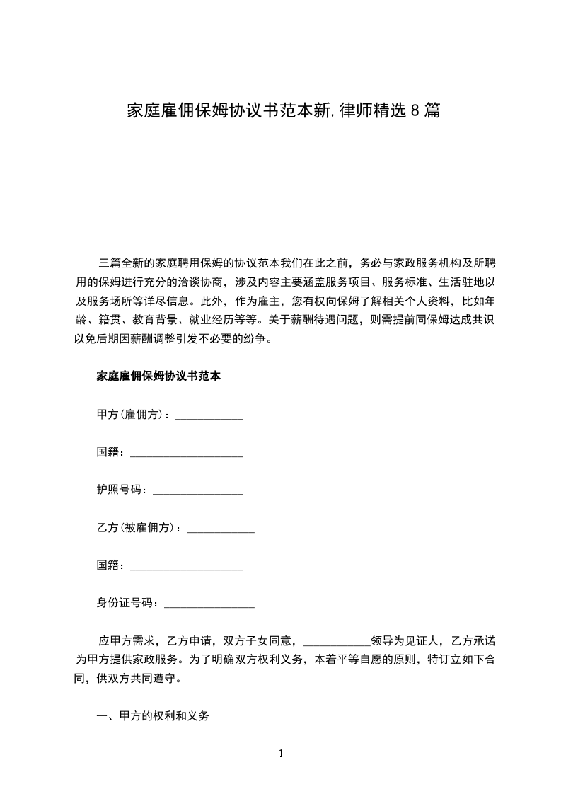 家庭雇佣保姆的全新协议书范本三篇在制定雇佣家庭保姆服务协议时,应当秉承平等公正、尊重自愿的原则实施签订过程。在此过程中,尤其需要关注以下几点关键内容:首先,需要明确规定协议的有效期;其次,就报酬水平以及付款方式作详细说明;第三,对保姆所承担的工作职责及具体要求进行整体规划;第四,对可能出现的特殊情况及应对措施予以明确规定;最后,针对协议双方的权利与义务,以及相应的违约责任,也需进行详尽的规定。
