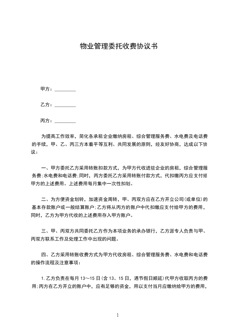 为方便甲方所管理的" "项目的住户和商户(以下两者统称为客户)缴交物业管理费、水费、电费、燃气费、停车费,并有利于双方更好地开展业务, 现甲方委托乙方代扣物业管理费。在本着双方互惠互利和遵守银行结算纪律的原则上,现经双方友好协商,达成以下的协议: