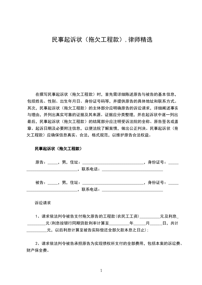 1、请求依法判令被告支付拖欠原告的工程款(农民工工资)__________元及利息__________元(利息按银行同期贷款利率计算至__________年______月______日,共计__________元,以后利息计算至被告实际偿还全部欠款本息之日止);