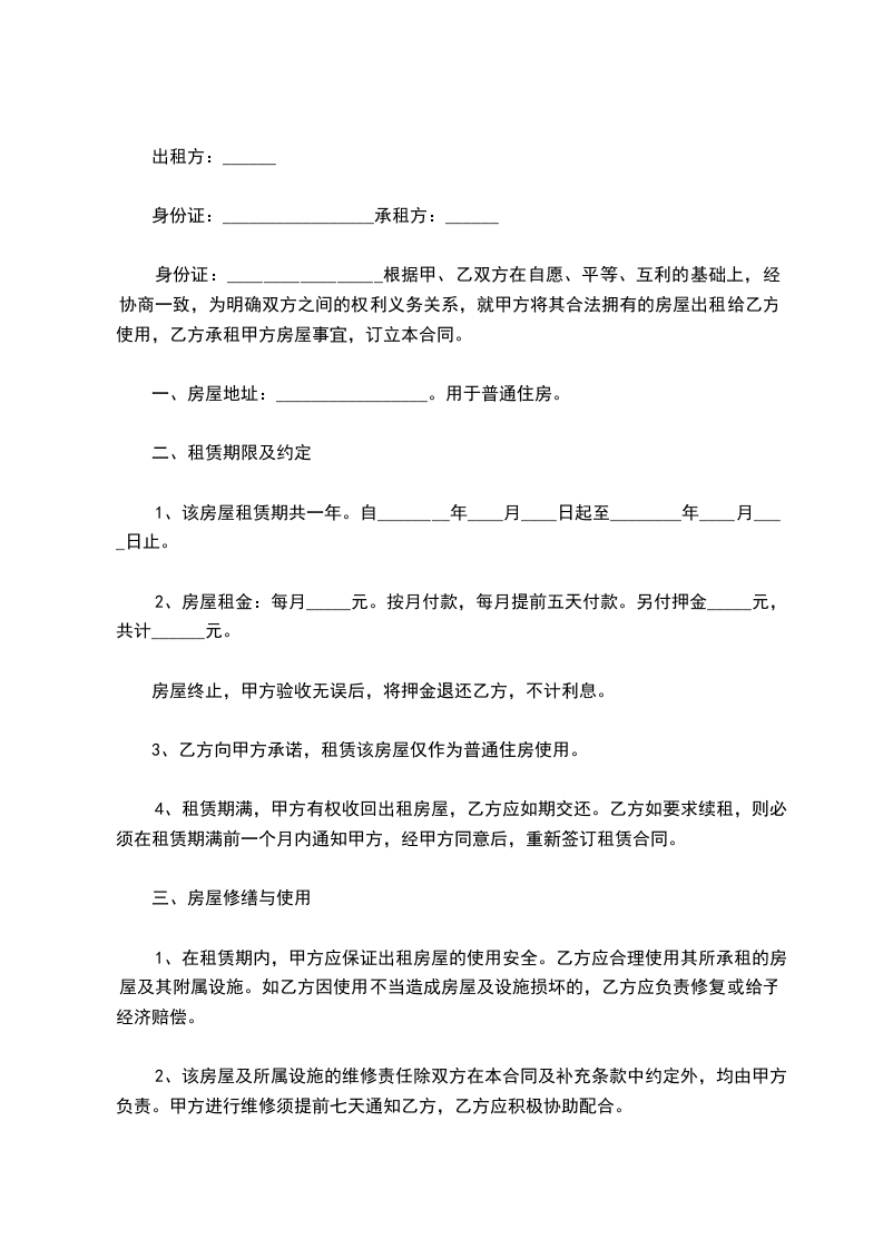 身份证:_________________根据甲、乙双方在自愿、平等、互利的基础上,经协商一致,为明确双方之间的权利义务关系,就甲方将其合法拥有的房屋出租给乙方使用,乙方承租甲方房屋事宜,订立本合同。