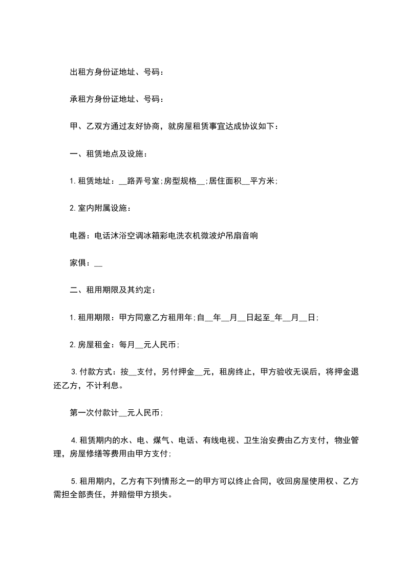 2、若承租方在出租方没有违反本合同的情况下提前解除合同视为承租方违约承租方负责赔偿违约金_________元。