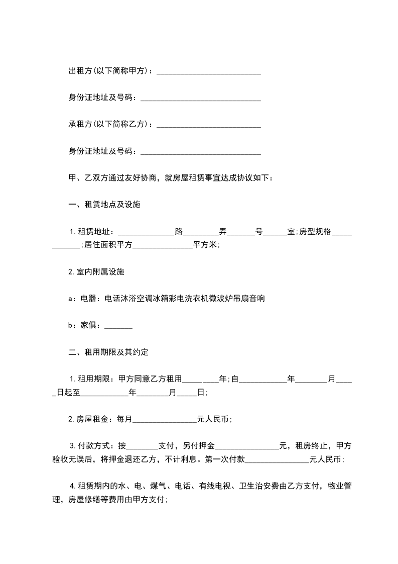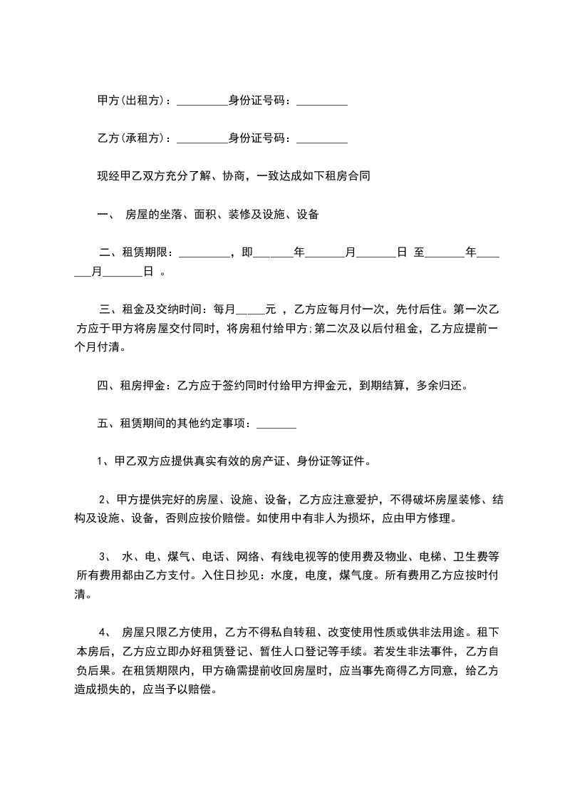 一、租金标准及支付方式每个月¥:________元/月,房屋押金个月元待合同期满或特殊情况导致的合同结束乙方退租后返还。