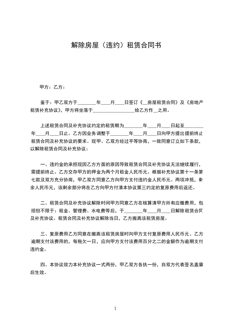 二、租赁合同及补充协议解除时间甲方同意乙方在核算清甲方所有应缴费用,包括但不限于:租金、管理费、水电费等后,于________年____月____日解除租赁合同及补充协议。租赁合同及补充协议解除当日,乙方搬离该租赁房屋。