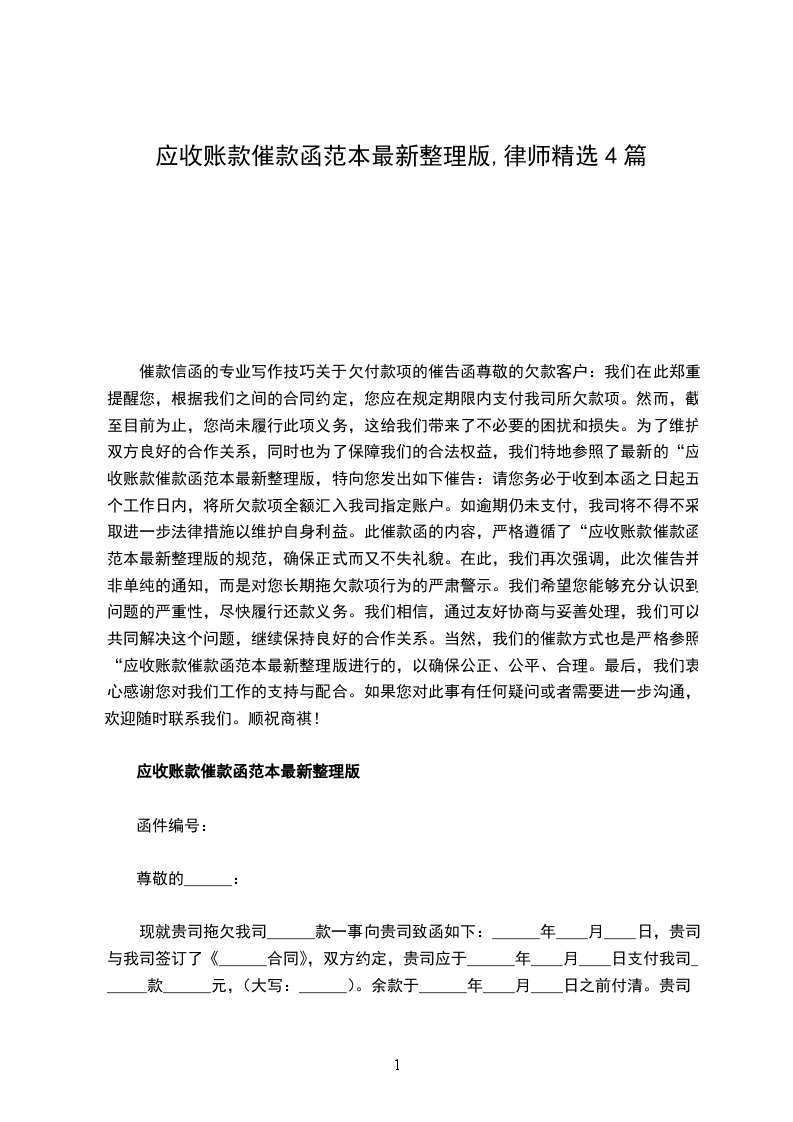 关于“应收账款催款函的相关事宜说明尊敬的各位债权人与债务人:根据现行的法律法规及行业惯例,我们特别对关于“应收账款催款函的相关法律问题进行详尽阐述,旨在为广大债权人与债务人提供清晰明确的指引。为了帮助您更好地理解和使用“应收账款催款函,我们特地整理了应收账款催款函范本最新整理版,供您参考。首先,我们需要明确指出,“应收账款催款函本身并非具备直接的法律约束力。其主要功能在于提醒并敦促对方尽快履行支付义务,以维护自身合法权益。在此,我们推荐使用应收账款催款函范本最新整理版,以确保函件内容的专业性和准确性。然而,在某些特殊情形下,该函件亦可被视为有效的证据材料,从而产生相应的法律效应。其次,“应收账款催款函通常由债权人向债务人发送,用以提示并督促债务人尽快清偿尚未偿还的债务。在此,我们建议您在撰写“应收账款催款函时,可以参考应收账款催款函范本最新整理版,以确保函件的格式和内容符合行业标准和法律要求。这是债权人主张自身权益的重要方式之一,但需注意的是,该函件本身并不具备直接的强制执行力。在此,我们建议各债权人在撰写“应收账款催款函时,务必遵循几点注意事项,并参考应收账款催款函范本最新整理版进行撰写:1. 确保函件内容真实准确,符合事实真相;2. 措辞应尽量温和礼貌,避免使用过于强硬或威胁性的言辞;3. 明确告知债务人逾期还款所面临的法律后果,如利息、违约金等;4. 保留好相关证据材料,以便在必要时进行举证。最后,我们再次强调,“应收账款催款函仅为一种提醒和催促的工具,其本身不具备直接的法律约束力。因此,债权人在采取任何行动之前,仍需谨慎考虑,并寻求专业律师的意见和建议。同时,我们也建议您定期更新您的应收账款催款函范本,以确保函件内容符合最新的法律法规和行业惯例。希望以上信息能对您有所帮助,如有其他疑问,请随时联系我们。顺祝商祺!