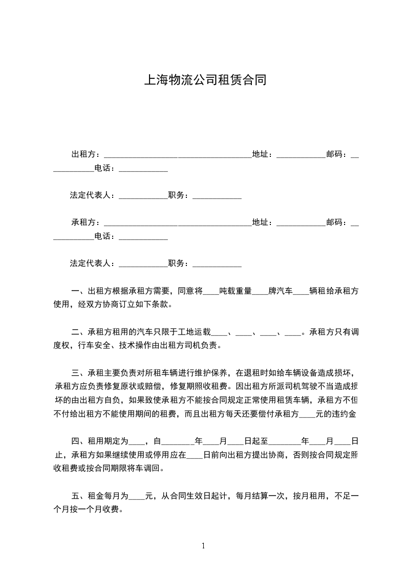 一、出租方根据承租方需要,同意将____吨载重量____牌汽车____辆租给承租方使用,经双方协商订立如下条款。