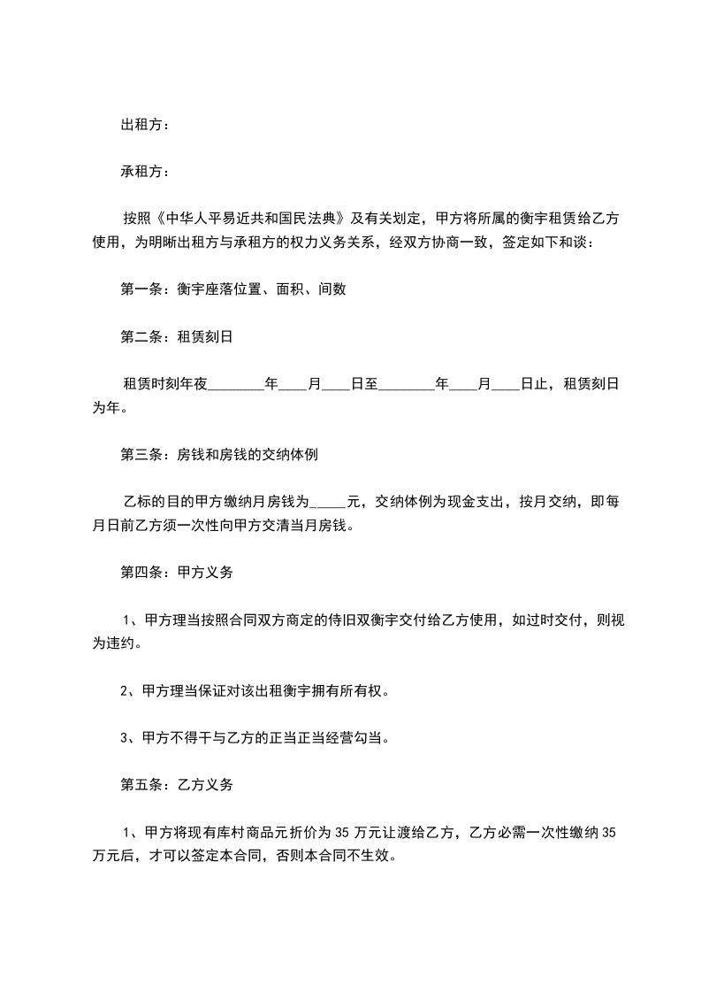 按照《中华人平易近共和国民法典》及有关划定,甲方将所属的衡宇租赁给乙方使用,为明晰出租方与承租方的权力义务关系,经双方协商一致,签定如下和谈: