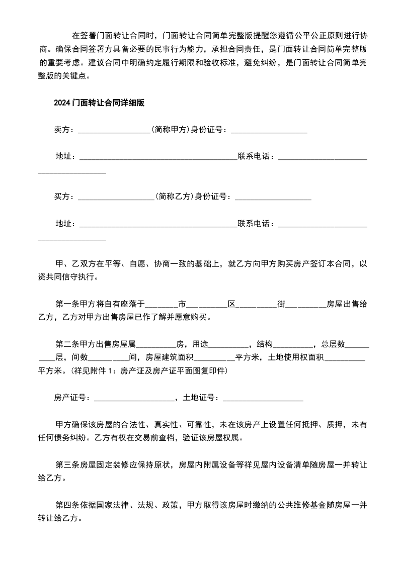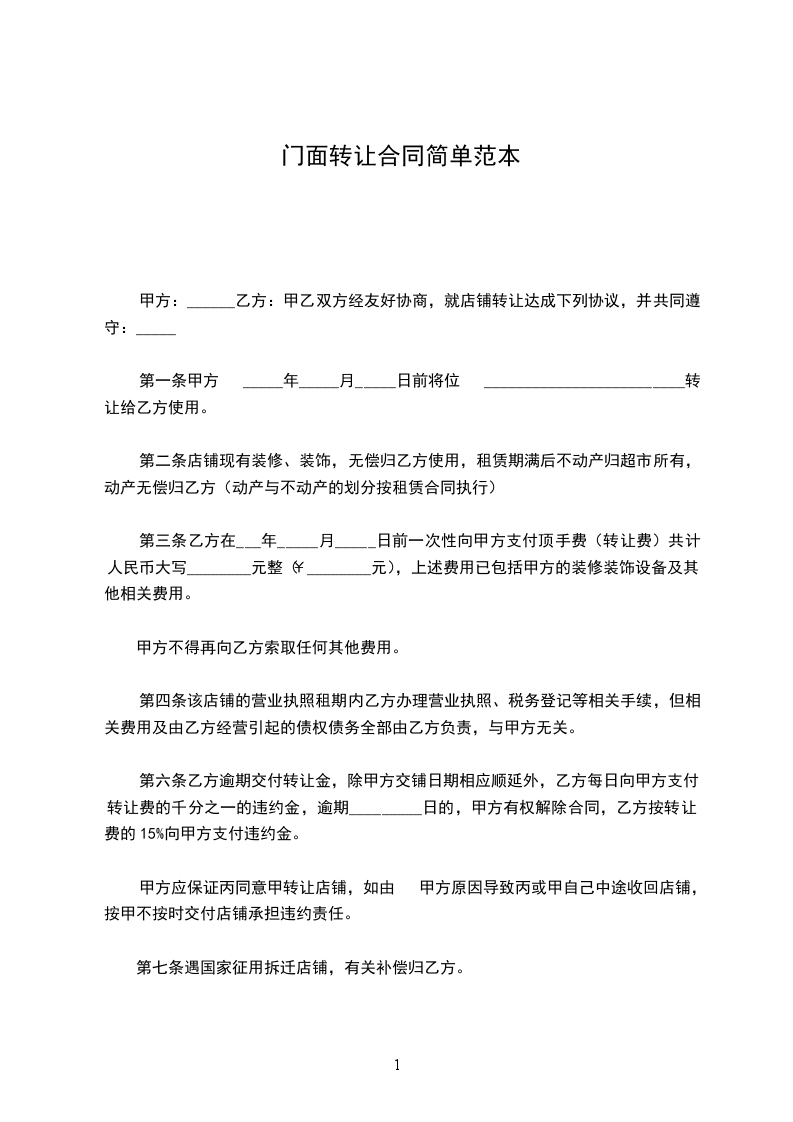 第一条 甲方于________年____月____日前将位于_________的门面(面积为_________平方米)转让给乙方使用。