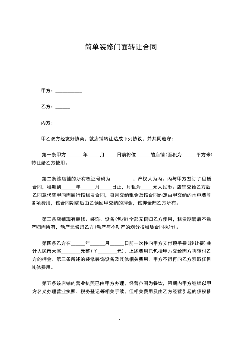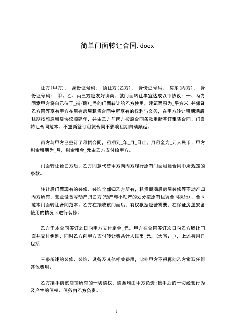 转让方(甲方):顶让方(乙方):房东(丙方):身份证号码:身份证号码:身份证号码:甲、乙、丙三方经友好协商,就门面转让事宜达成以下协议: