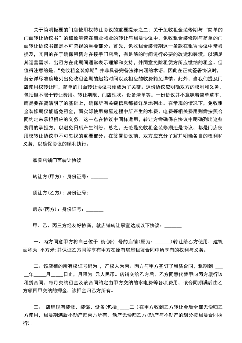 甲方签字:乙方签字:丙方签字:签订日期:_2签订地点:_篇二转让方(甲方):身份证号码:顶让方(乙方):身份证号码:甲、乙、双方经友好协商,就店铺转让事宜达成以下协议: