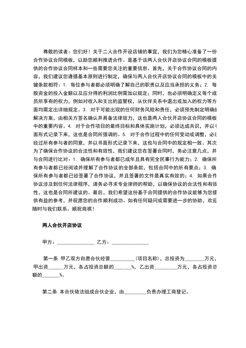 尊敬的读者:您们好!关于二人合作开设店铺的事宜,我们为您精心准备了一份合作协议合同模板,以助您顺利推进合作。是基于该两人合伙开店协议合同的模板提供的合作协议合同样本和一些需要您关注的重要信息。首先,关于合作协议合同的内容,我们建议您遵循基本原则进行制定,确保与两人合伙开店协议合同的模板中的关键条款相符:1. 每位参与者都必须明确了解自己的职责以及应当承担的义务;2. 每股资金的投入金额以及应分得的利润比例需加以规定;同时,也必须明确定义每个成员所享有的权力,例如对收入和支出的监管权,从伙伴关系中退出或加入的权力等方面均需定出详细规定。3. 对于可能出现的任何财务风险和责任,必须预先制定明确的解决方案,由相关方签名确认并具备法律效力,这也是两人合伙开店协议合同的模板中的重要内容。4. 对于合作项目的最终目标和具体实施计划,必须达成共识,并以书面形式记录下来,这也是合同所强调的。5. 对于合作过程中的任何变动或调整,必须经过所有参与者的同意,并以书面形式记录下来,这也与合同中的规定相一致。其次,为了确保合作协议的合法性和有效性,我们建议您在签署合同时,务必注意几点,并与合同进行比对:1. 确保所有参与者都已成年且具有完全民事行为能力;2. 确保所有参与者都已经阅读并理解了合作协议的全部条款,包括合同中的所有要点;3. 确保所有参与者都已经签署了合作协议,并且签署的文件是真实有效的;4. 如果合作协议涉及到任何法律程序,请务必寻求专业律师的帮助,以确保协议的合法性和有效性,这也是合同所建议的。最后,我们希望这份基于合同提供的合作协议能够为您提供有益的参考,并祝愿您的合作顺利成功。如有任何疑问或需要进一步的协助,欢迎随时与我们联系。顺祝商祺!