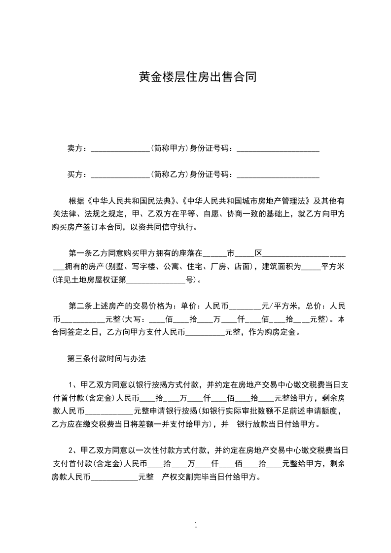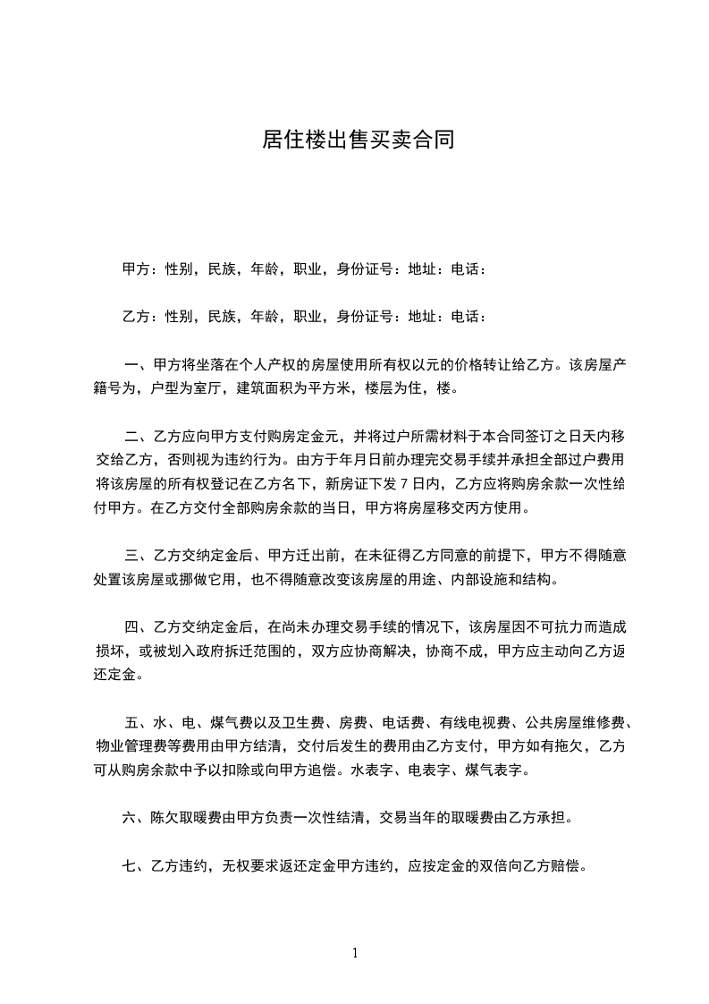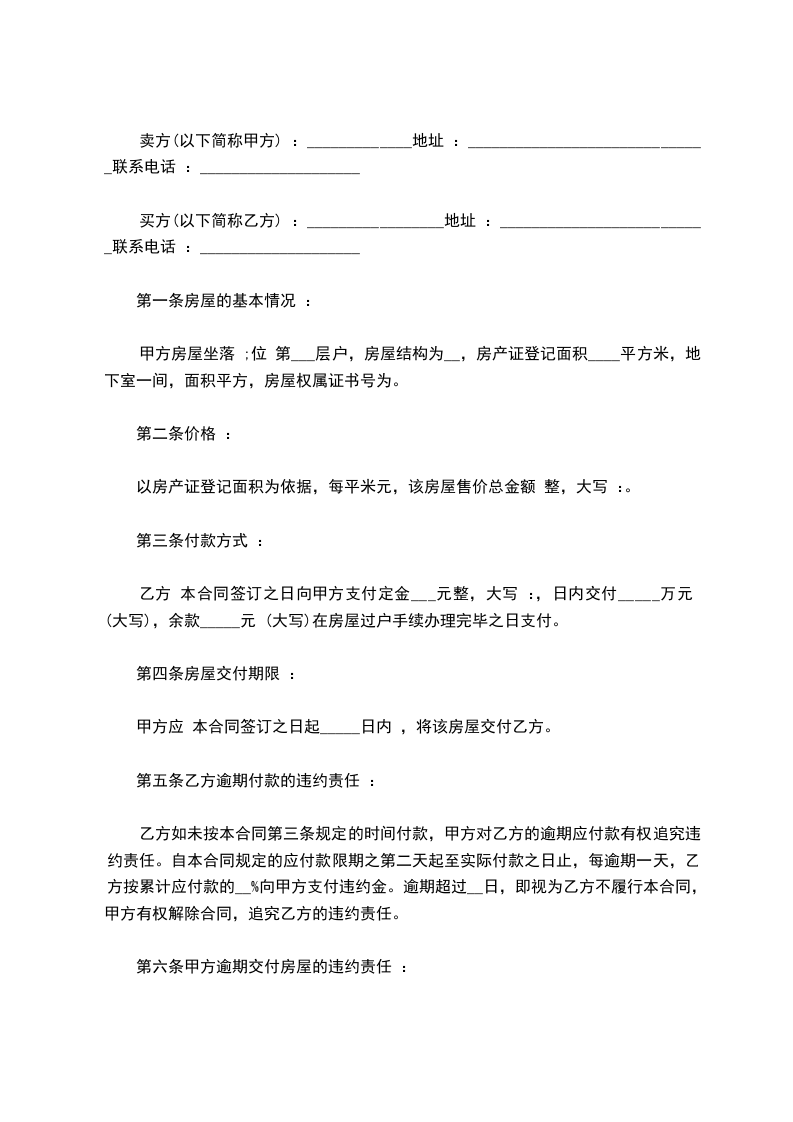 一、甲方将坐落在个人产权的房屋使用所有权以元的价格转让给乙方。该房屋产籍号为,户型为室厅,建筑面积为_____平方米,楼层为住,楼。