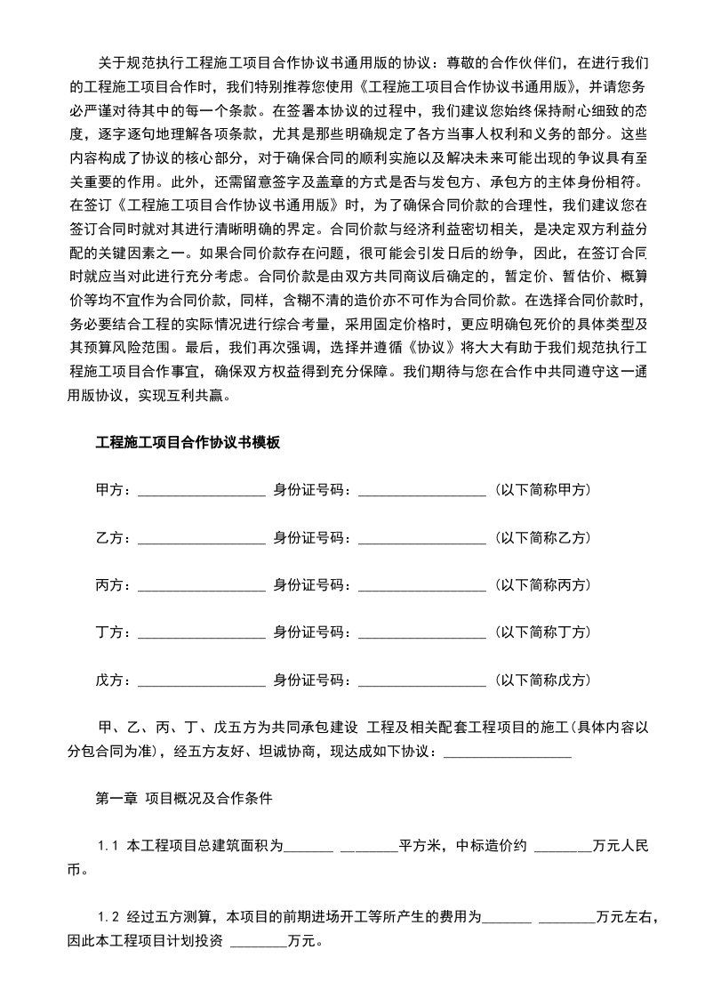 工程施工项目合作协议书甲方:身份证号码:(以下简称甲方)乙方:身份证号码:(以下简称乙方)按照平等互利、团结协作、共同发展的精神。甲、乙、双方共同承包工程项目的施工(具体内容以承包合同为准),经双方友好、坦诚协商,现达成如下协议: