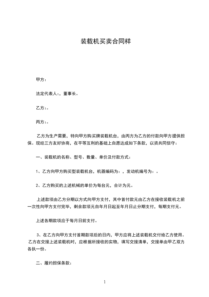 乙方为生产需要,特向甲方购买牌装载机台,由丙方为乙方的付款向甲方提供担保。现经三方友好协商,在平等互利的基础上自愿达成如下条款,以资共同信守: