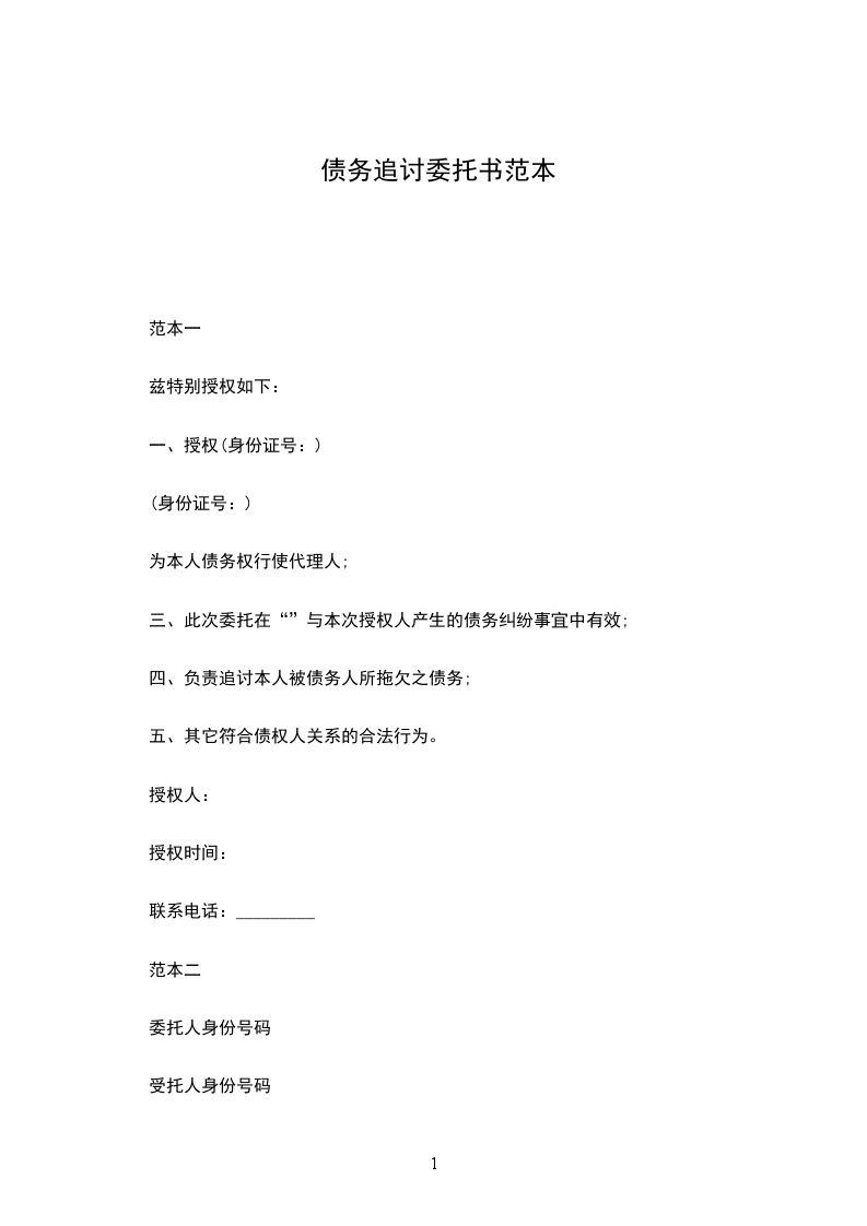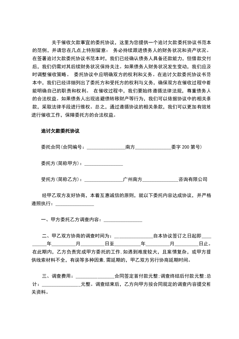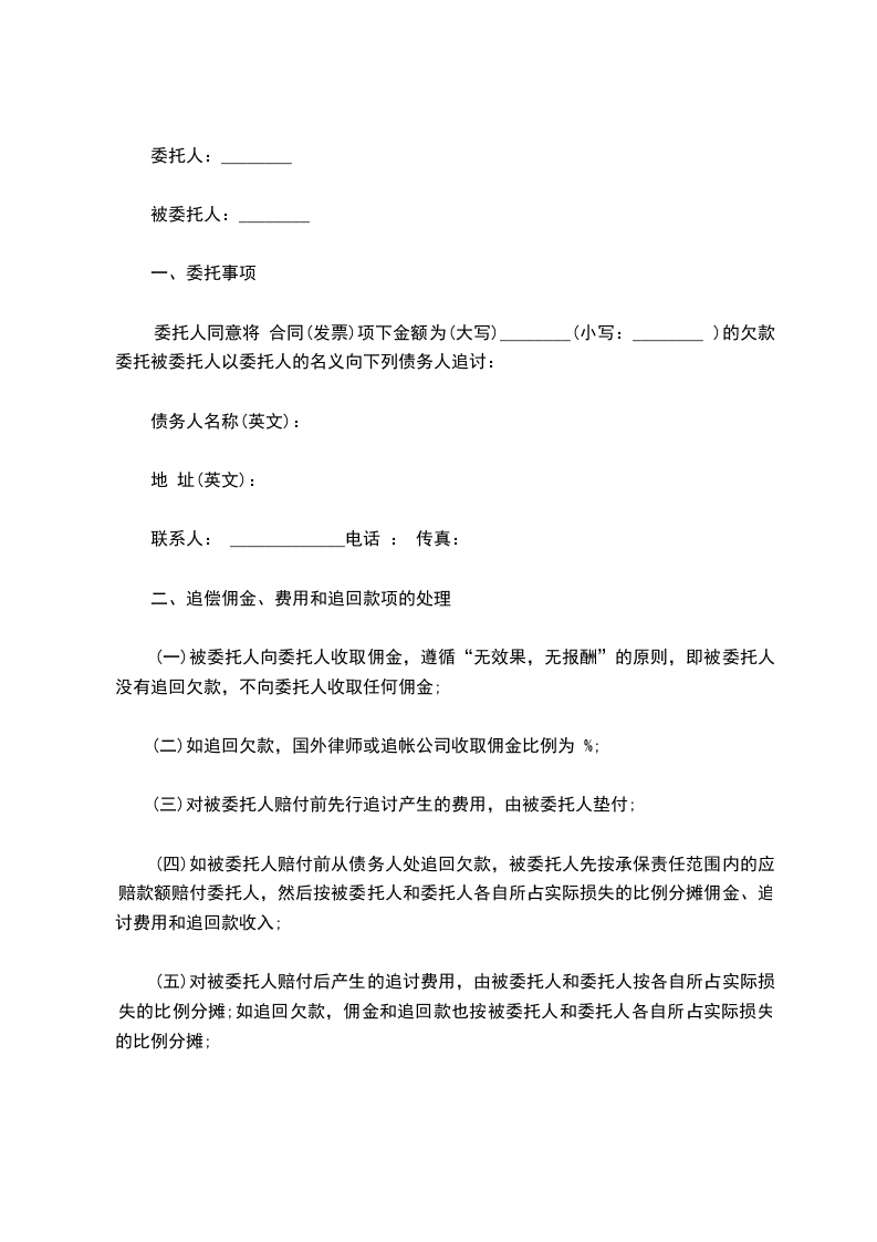 委托人同意将_____________合同(发票)项下金额为(大写)_____________(小写:_________________)_________________的欠款委托被委托人以委托人的名义向下列债务人追讨:_________________